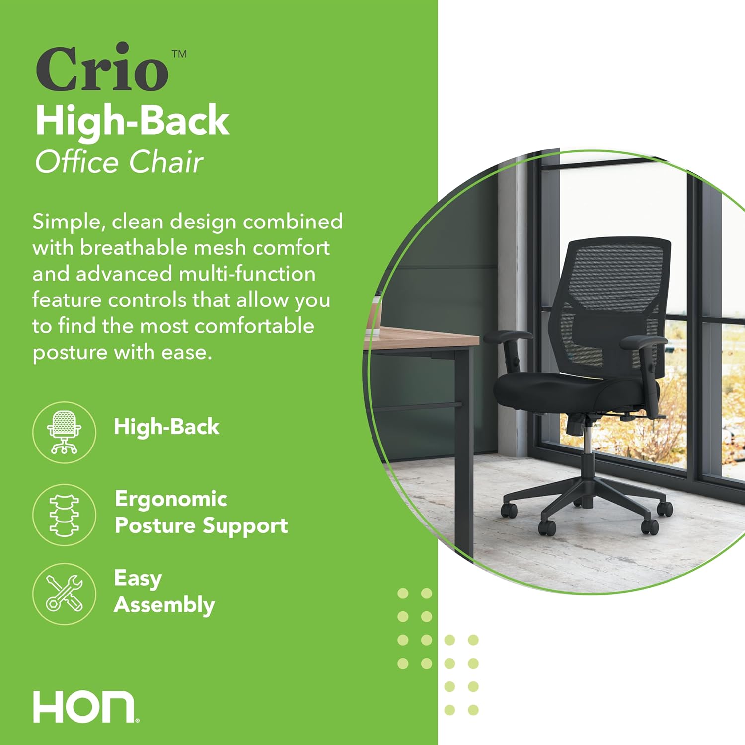 HON Crio High Back Task Chair, Ergonomic Office Chair with Adjustable Arms and Back Support, Lumbar Support, 360 Swivel, Adjustable Center-Tilt Recline, for Computers, Desks, Home Office, Black