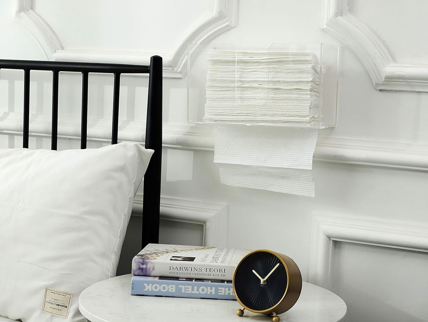 - VERSATILE PRODUCT:The paper towel dispenser is made of high quality acrylic,sturdy and durable,simple and modern appearance with one-piece construction that will brighten any restroom kitchen dining tables,restaurant,club,offices desk,classroom etc.Wall hanging design helps save space and help keep workspace neat and tidy also easy to clean
