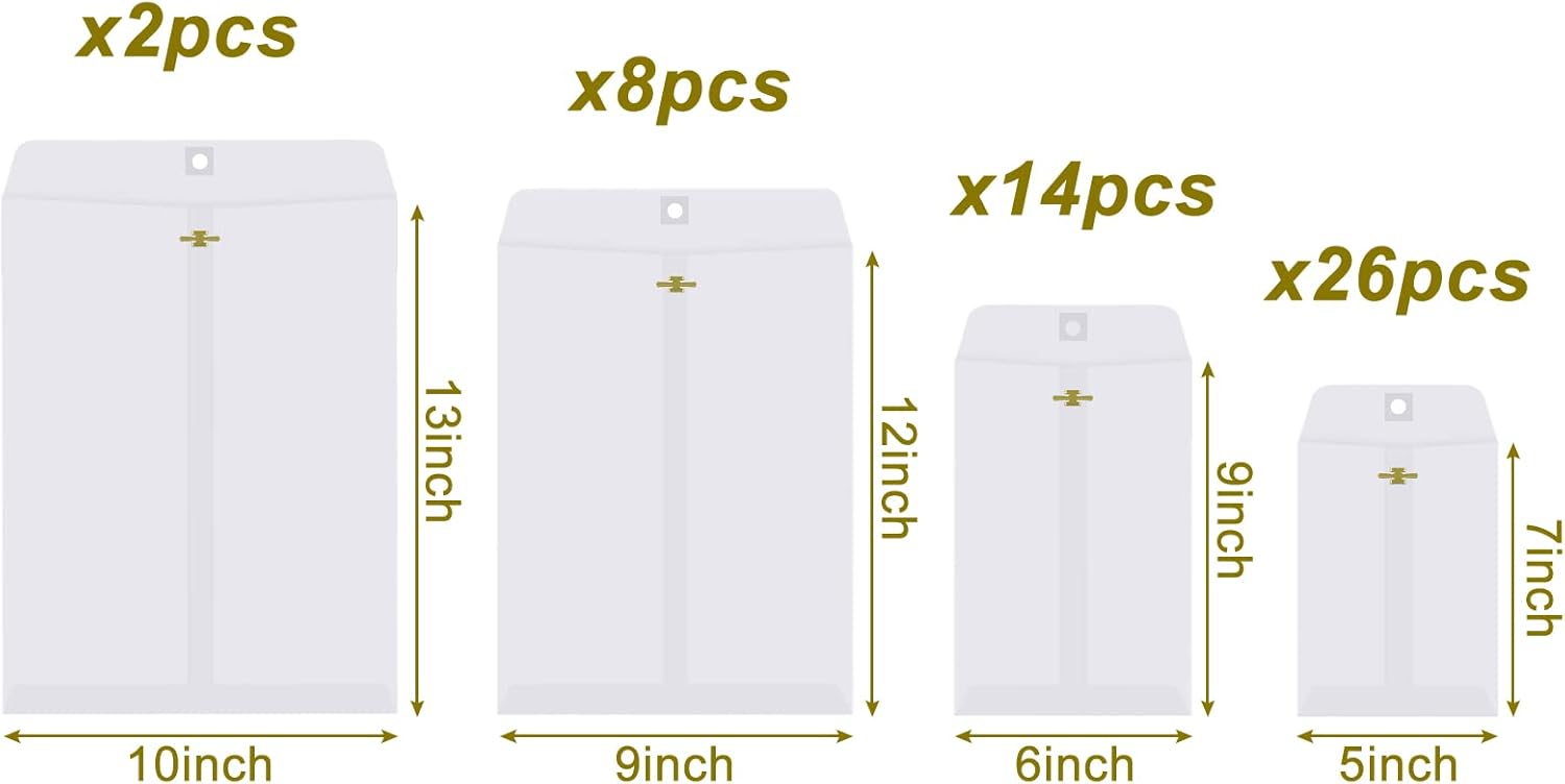 - Adequate supplies: 50 pieces clasp envelopes with flaps are available in 4 different sizes, you will get 26 pieces envelopes of 5 x 7 inch, 14 pieces envelopes of 6 x 9 inch, 8 pieces envelopes of 9 x 12 inch, 2 pieces envelopes of 10 x 13 inch, different sizes can hold various files in different sizes