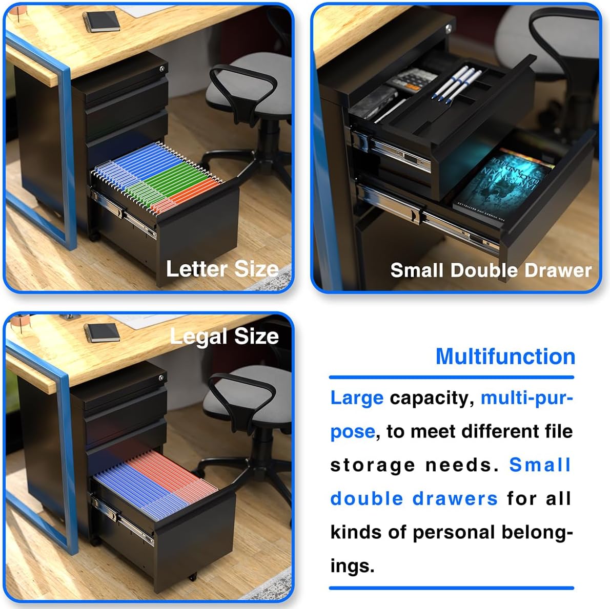 - Effortless Mobility with Advanced Wheels: Equipped with five 360-degree rotating wheels (including 2 lockable front wheels and a center wheel designed to prevent anti-tipping), this under desk file cabinet moves smoothly without producing noise, offering stability and ease of use in any workspace;