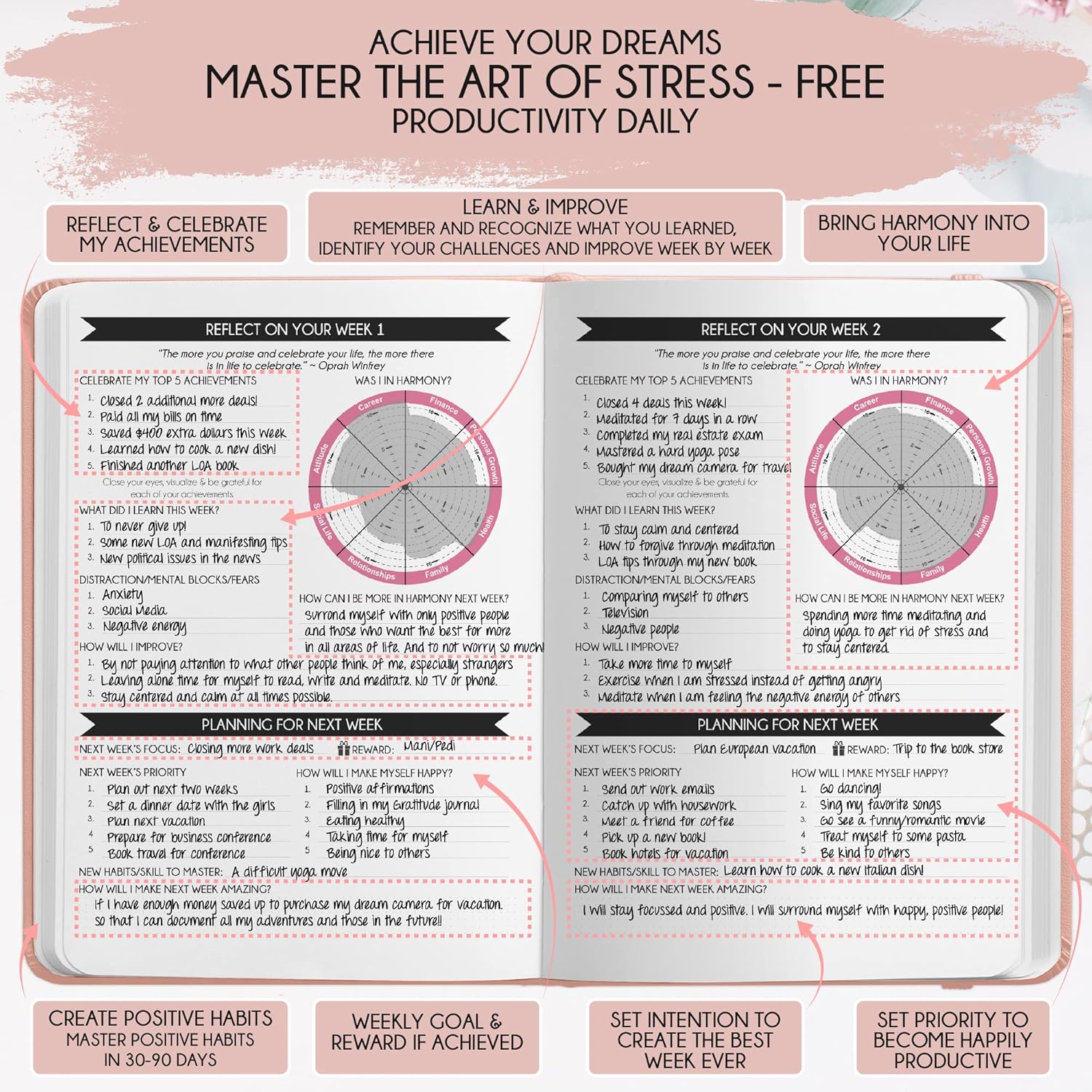 - GRATITUDE JOURNAL - This deluxe daily planner and gratitude journal for women comes in A5 size (5.8 x 8.3 inches). The life planner comprises 264 pages of thick 100 gsm paper, including 90 daily planning sheets, guiding you on how to become the best possible version of yourself on a mental, physical, and interpersonal level. It's a unique diary based on leading scientific studies proven to increase productivity and happiness. The journal features an out-foldable vision board to help you stay focused, morning and evening power questions, mind maps, reflection pages, habit trackers, a back pocket, and much more than any other planner on the market!