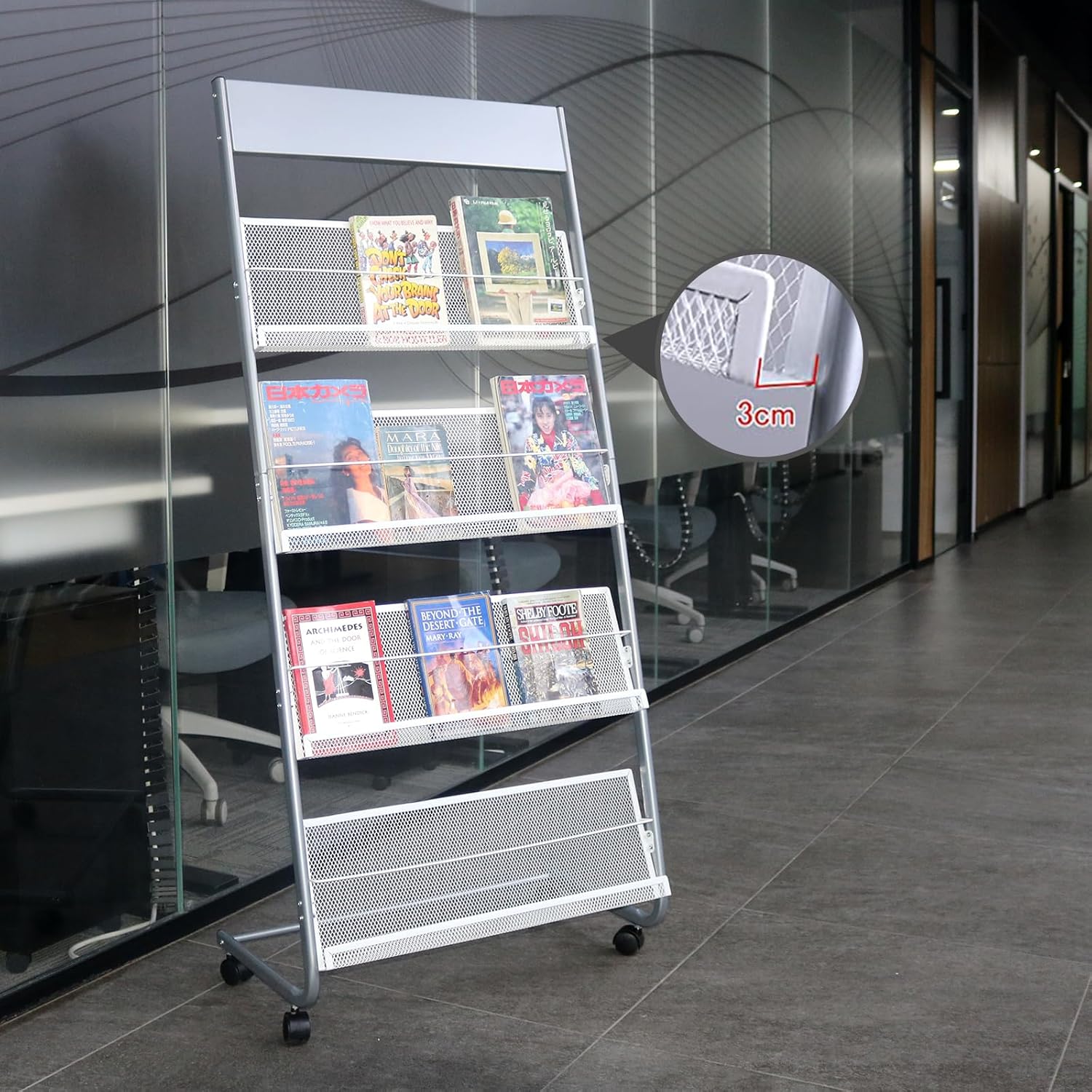 4-Layer Iron Magazine Rack with Wheels, Newspaper Rack, Display Rack, Silver (63)