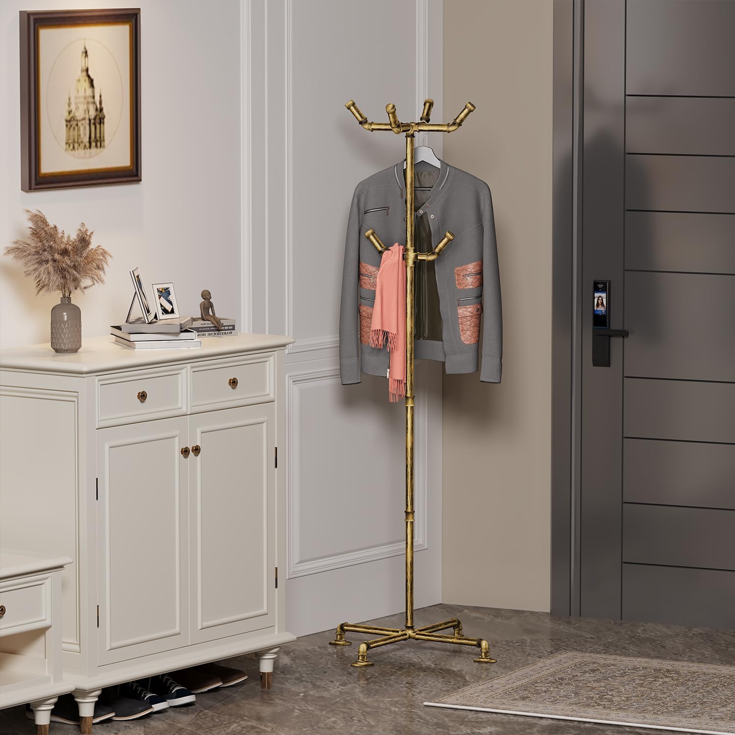 - This coat rack size is about W20*H67 inch & Crafted of 3/4” pipe steel that stronger than other products. An antique gold finish just makes you feel all warm and cozy.