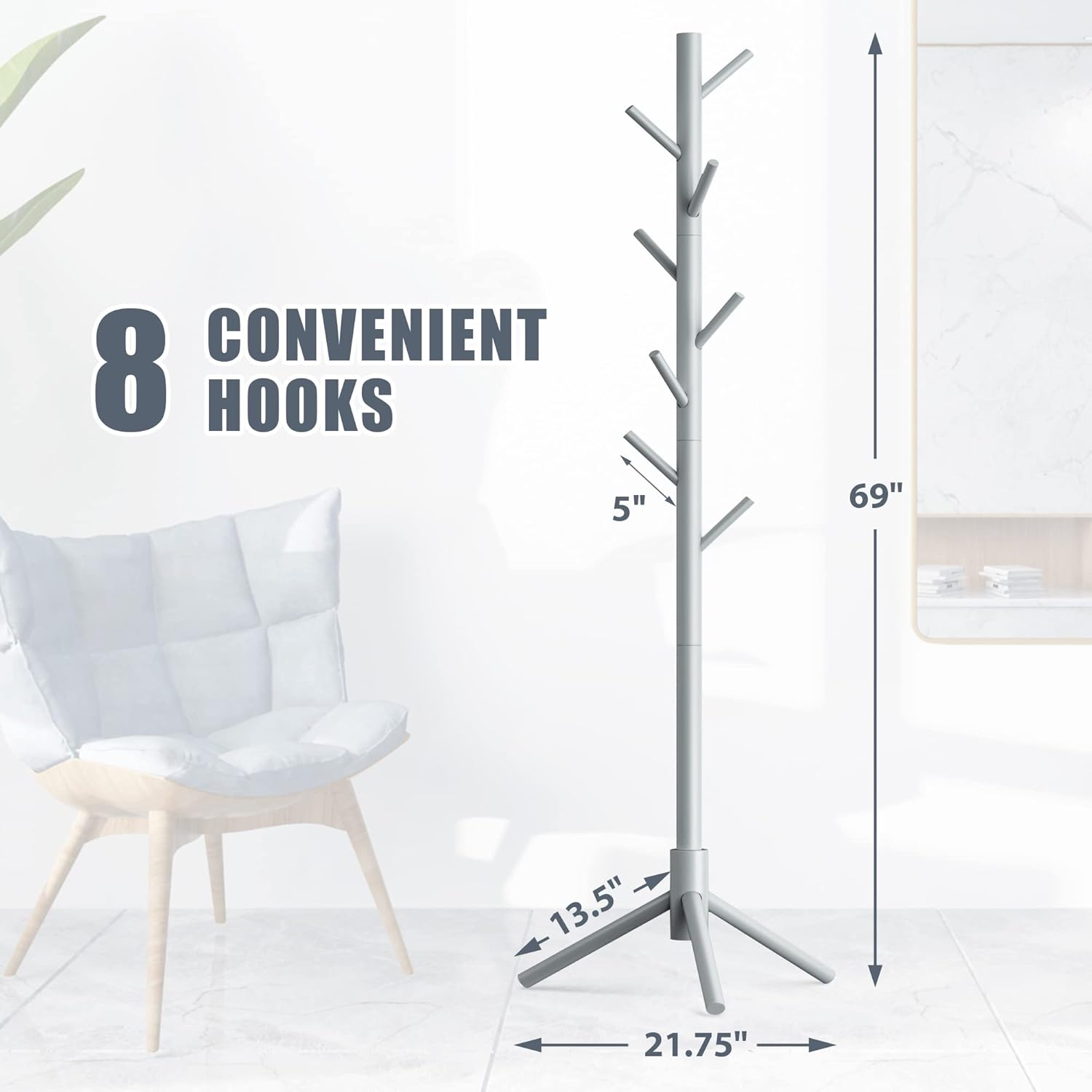 Haddockway Wooden Coat Rack Stand with 8 Hooks New Zealand Pine 3 Adjustable Coat Standing Tree Easy Assembly for Coats, Hats, Scarves and Handbags for Entryway, Hallway, Bedroom, Office