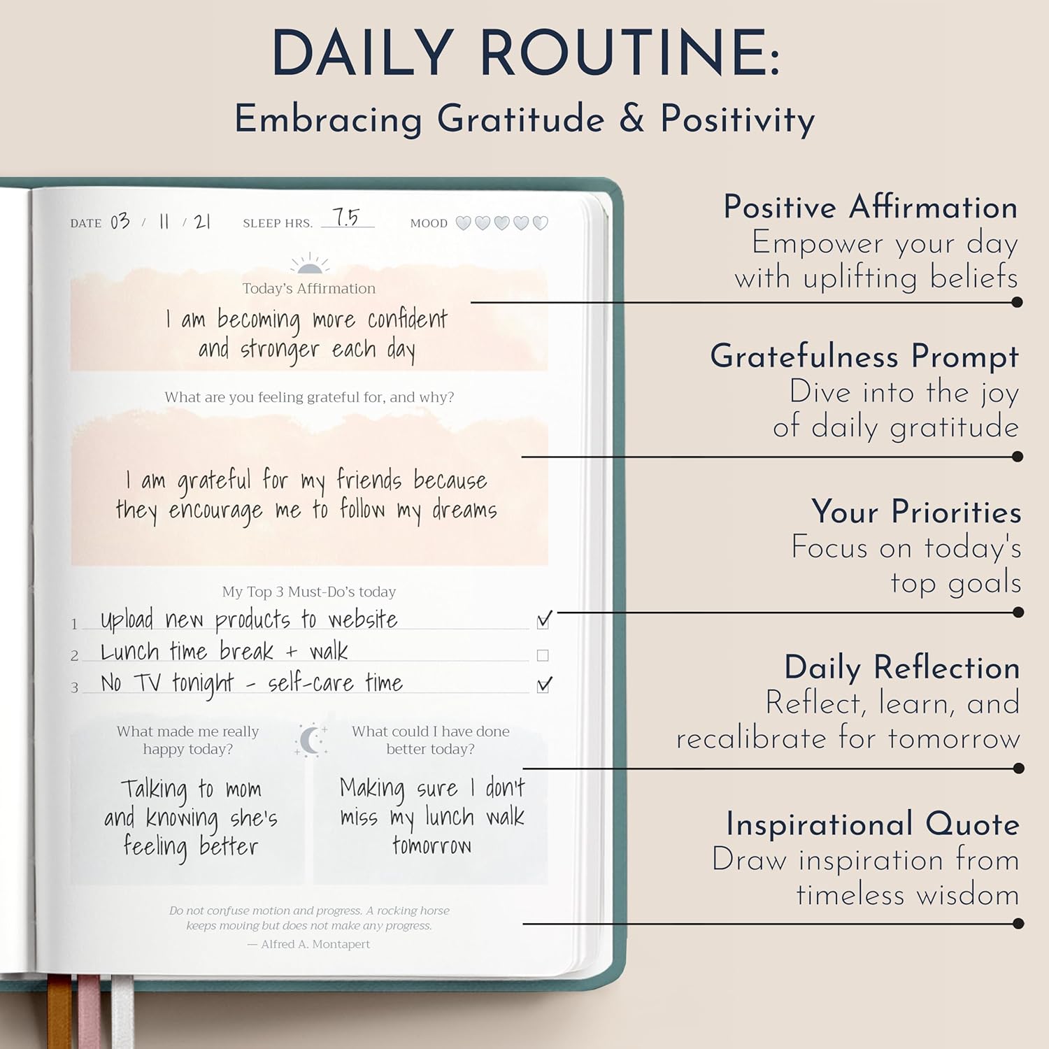 - Daily Dose of Positivity - Boost your day with uplifting positive affirmations and bask in the joy of daily gratitude prompts. Stay centered with a focus on today's paramount goals. Engage in meaningful daily reflection to recalibrate for tomorrow, and draw motivation from handpicked inspirational quotes, channeling timeless wisdom.