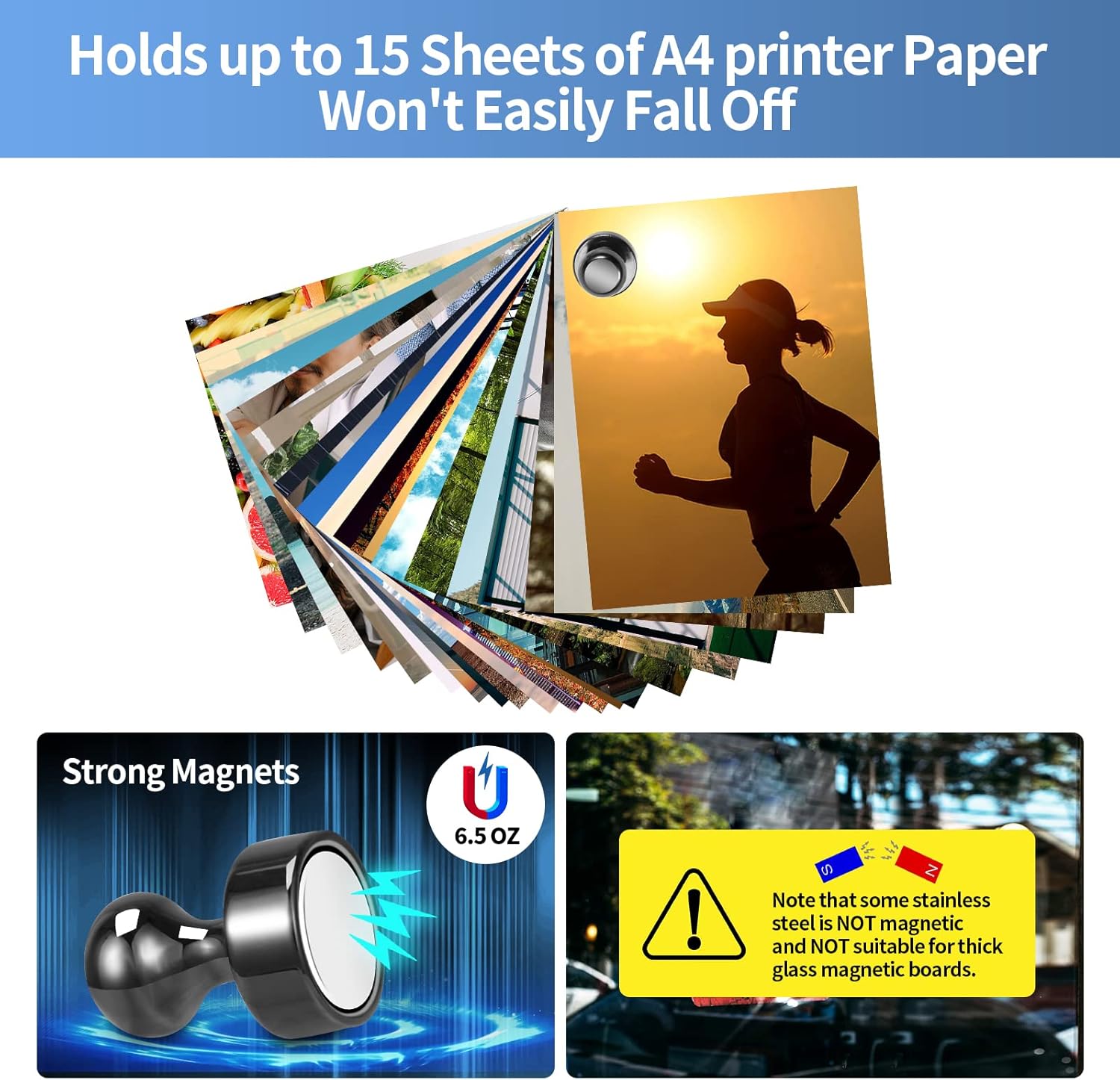 - đ»ăStrong Fridge MagnetsăDo not be fooled by these refrigerator magnets strong, They can hold up to 15 sheets of A4 printer paper at once with just a tiny magnet. Even possible to use them in the kitchen to hold cooking tools that weigh no more than 6.5 OZ and the cooking tools won't easily fall off.
