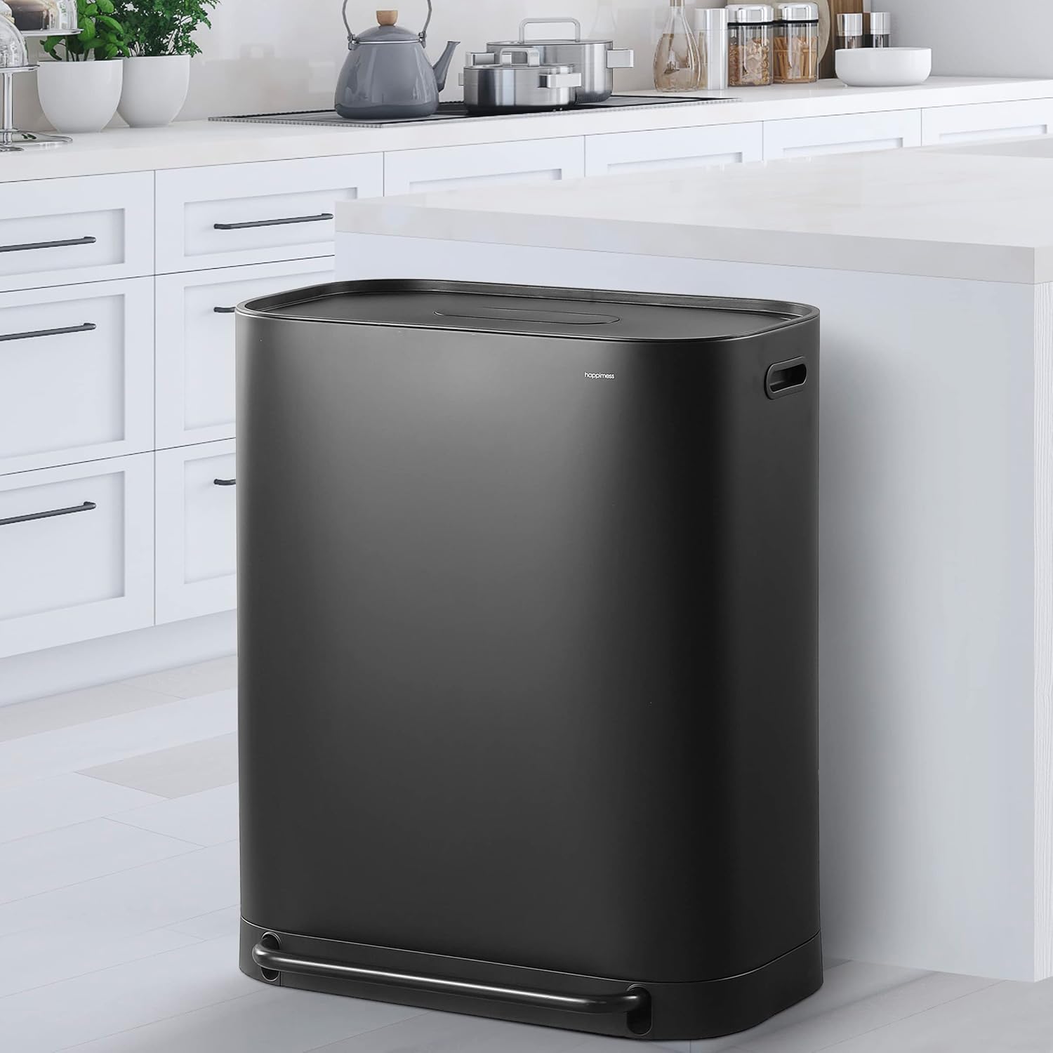happimess HPM1014B Beni Kitchen 16-Gallon Double-Bucket Step-Open Trash Can with Soft-Close Lid, Modern, Minimalistic, Fingerprint Proof for Home, Kitchen, Laundry Room, Office, Bathroom, Black