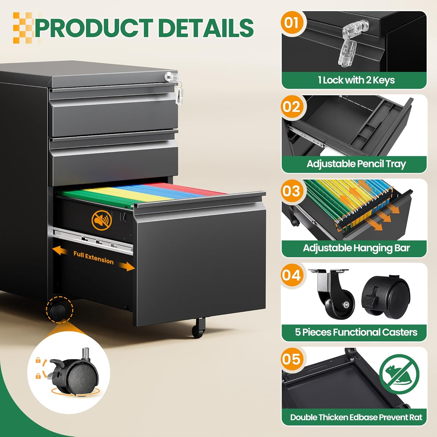 - ăRolling File Cabinetă: The black file cabinets for home office is equipped with 5 rotatable wheels, which includes 2 front casters with braking function, 2 back casters with 360° Swivel Casters and 1 center caster to prevent tipping over when all drawers opened at the same time. You can move file cabinet smoothly with 5 rolling casters to anywhere you want