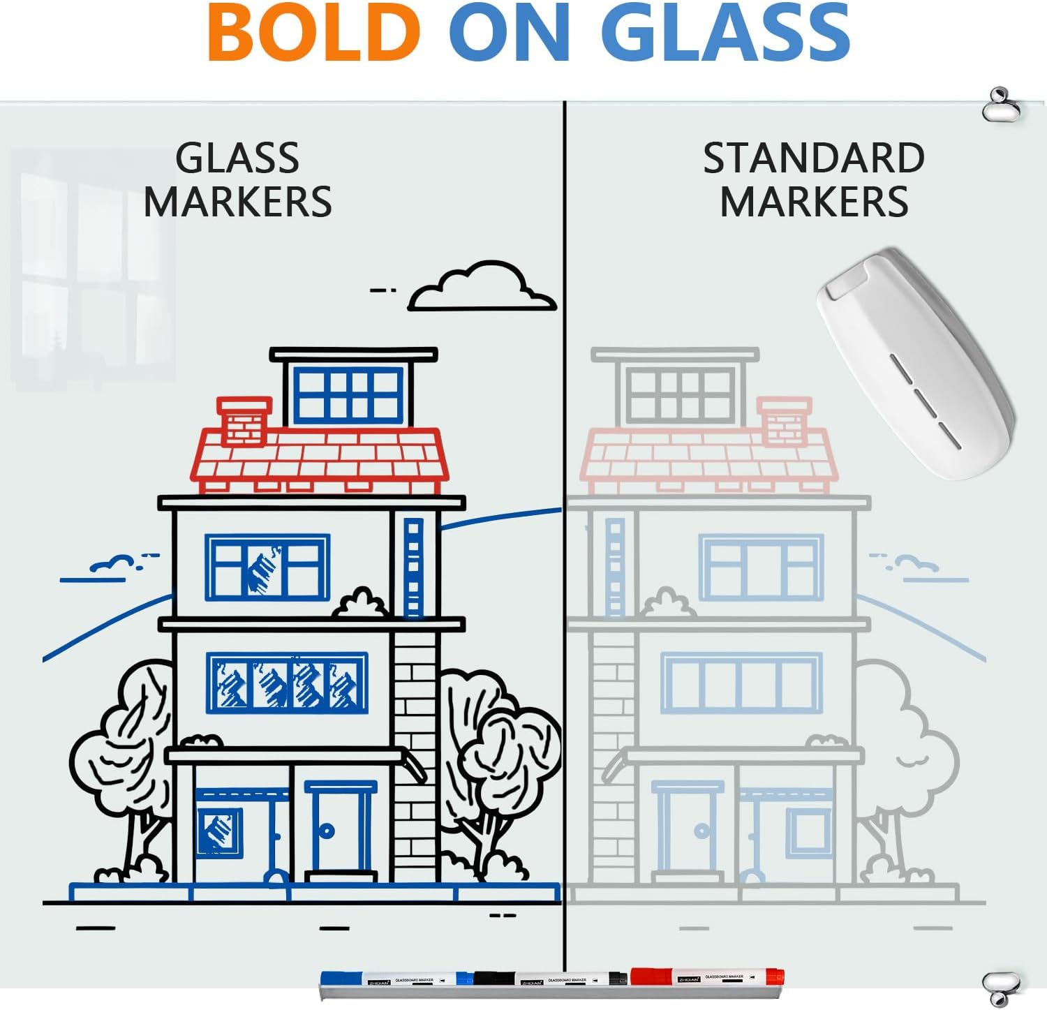 - 【PREMIUM ERASER & MARKERS】- Non-toxic, low-odor. Erase with less effort, simply glide This eraser over a dry-erase board with no vigorous scrubbing. The dual material of foam and felt smoothly picks up ink and dust. Premium glass dry-erase markers are optimized for use on glass boards. Markers delivers strong bold color every time, to ensure that your message is distinct and legible.