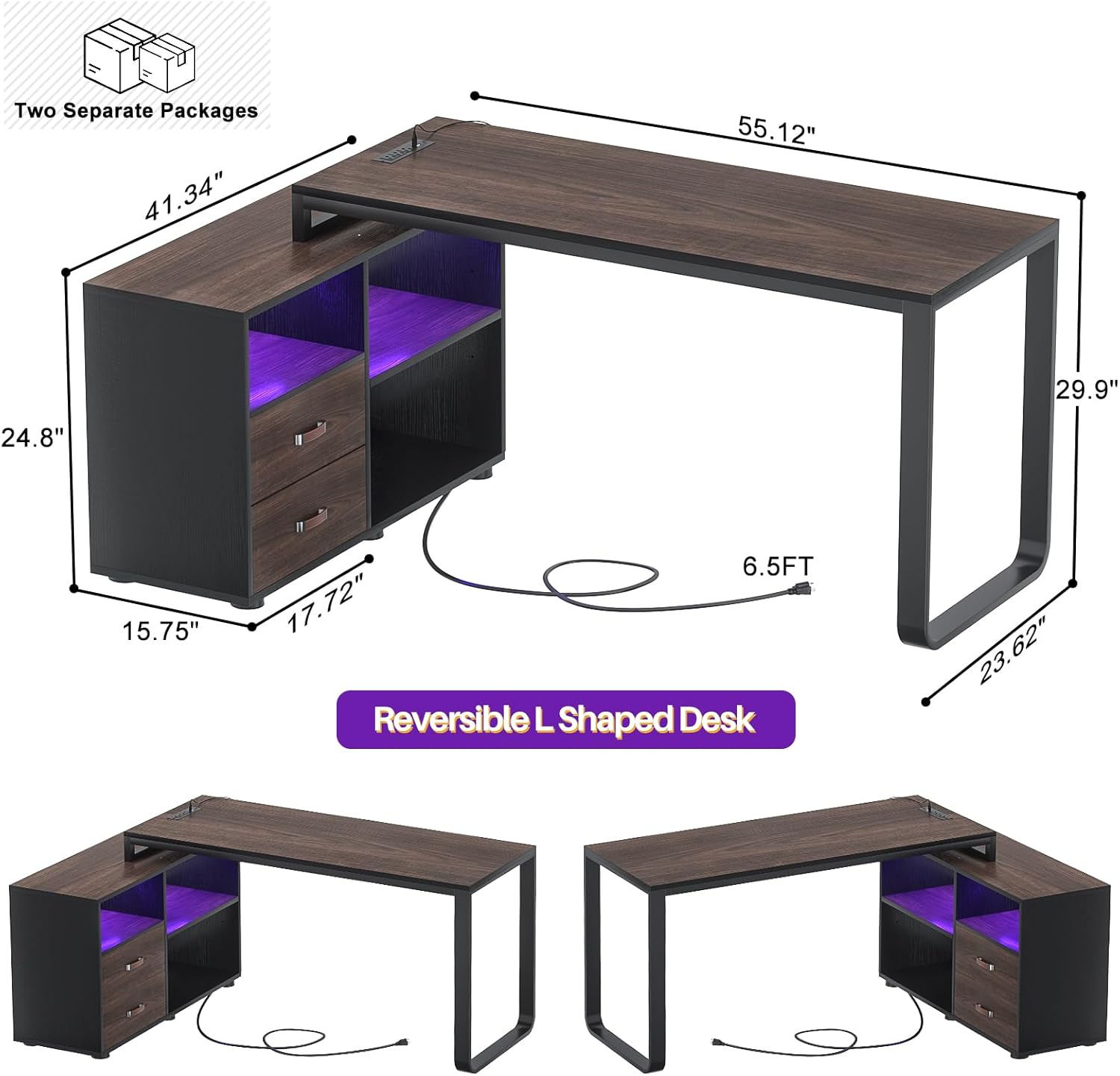 - Computer Desk with Socket & Smart LED Lights: Built-in power charge station (3 regular outlets and 2 USB ports included), which allows keeping your laptop, tablet, printer or other everyday devices nearby while charged. You can also control the LED lights with the App, and customize any color you like. Meanwhile, it has a variety of modes like music sync, timer functions, etc, providing a great ambiance for whatever mood you are in.