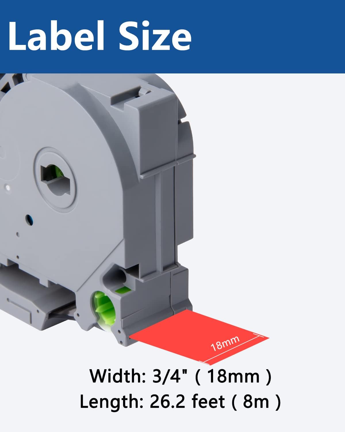 - Size - 3/4" width x 26.2' length ( 18mm x 8m ) each 18mm label maker tape. Color - Black ink on red tape