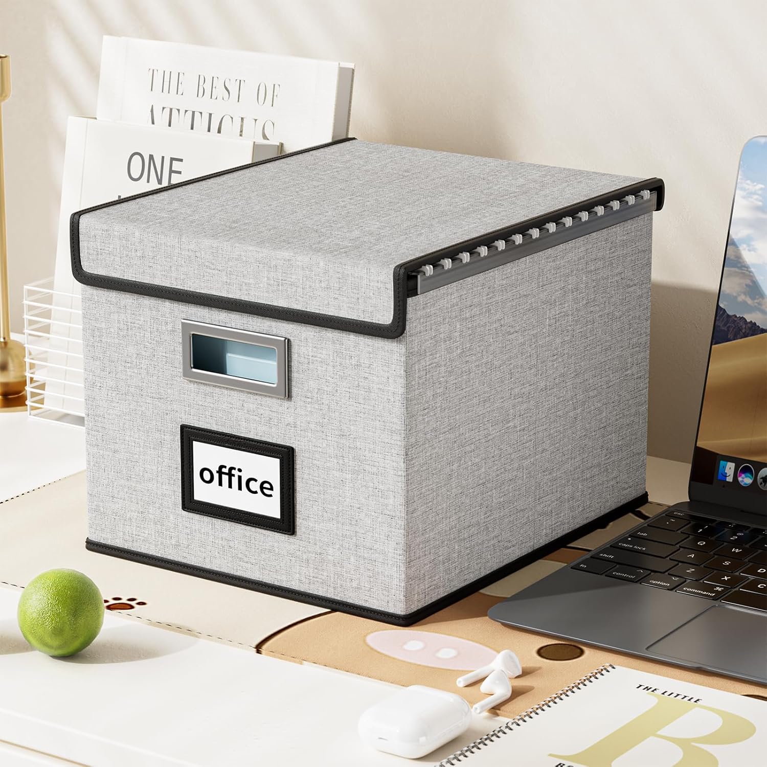 Huolewa File Organizer Box with Lid, Collapsible File Folder Organizer for Office Document Storage, Filing Box with Plastic Slide for Letter/Legal Size Hanging Files, Light Grey