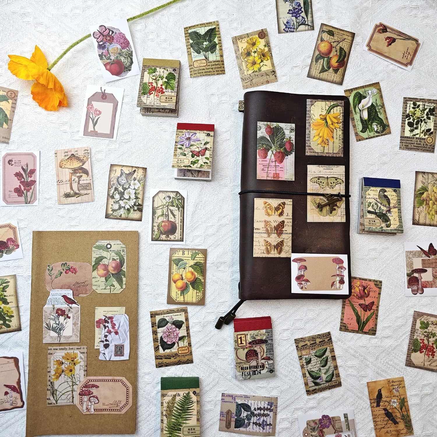 - 2.Versatile Designs: Vintage washi stickers come in a wide variety of designs and styles.Designs have 6 themes: Butterflies & Birds, Fruits, Herbs, Flowers, Yellow Tone Painting & Red Tone Painting. And stickers have 3 styles: normal picture style,chic frame style,and fake slot hole hang tag style. From exquisite bird and butterfly patterns to elegant floral designs, allowing you to express your creativity and personalize your projects.