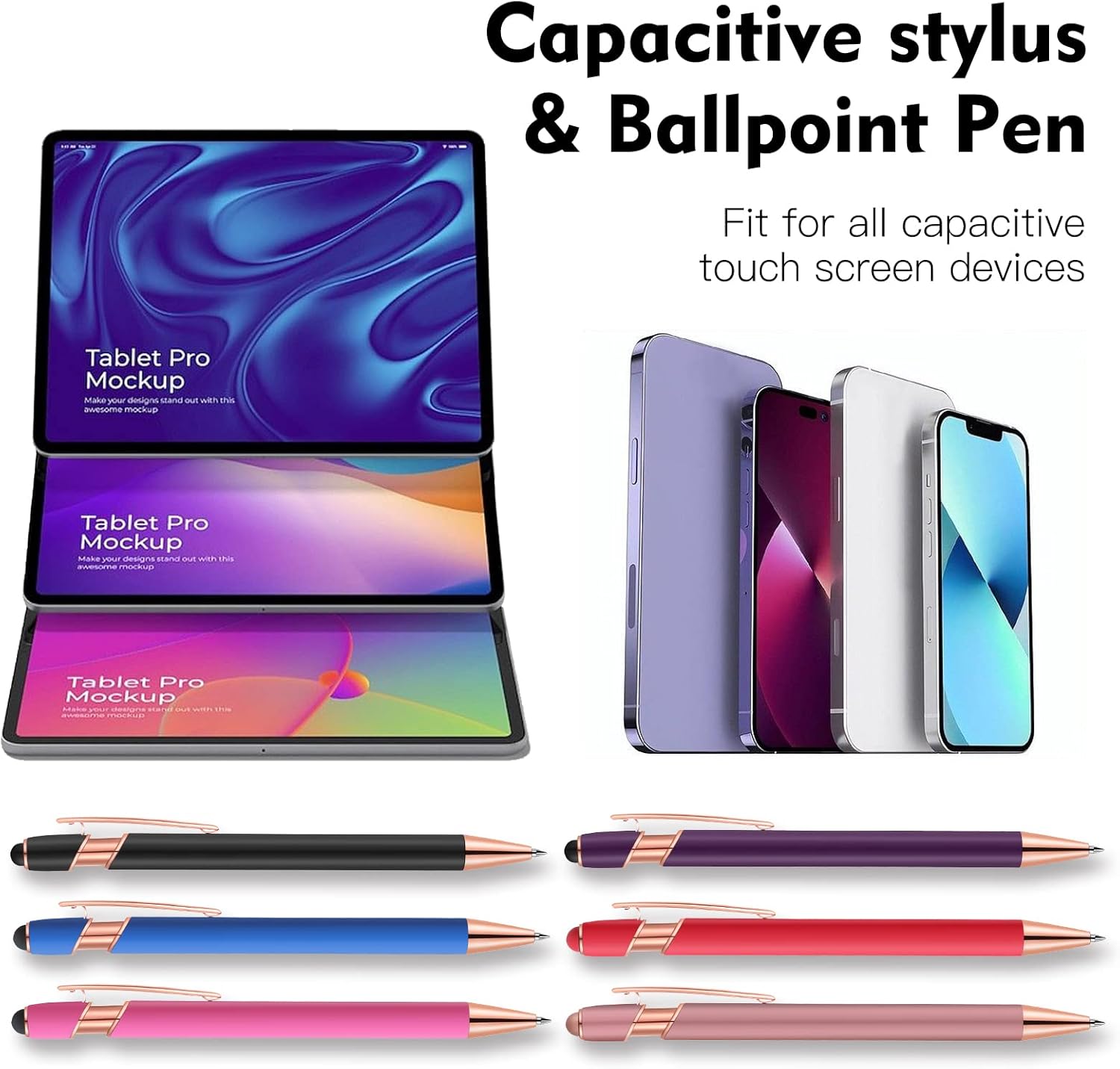 12 PCS 2 in 1 Stylus Ballpoint Pen with Stylus Tip, 1.0 mm Black Ink Metal Pen Stylus Pen for Touch Screens (Rose glod & 6 Colors)