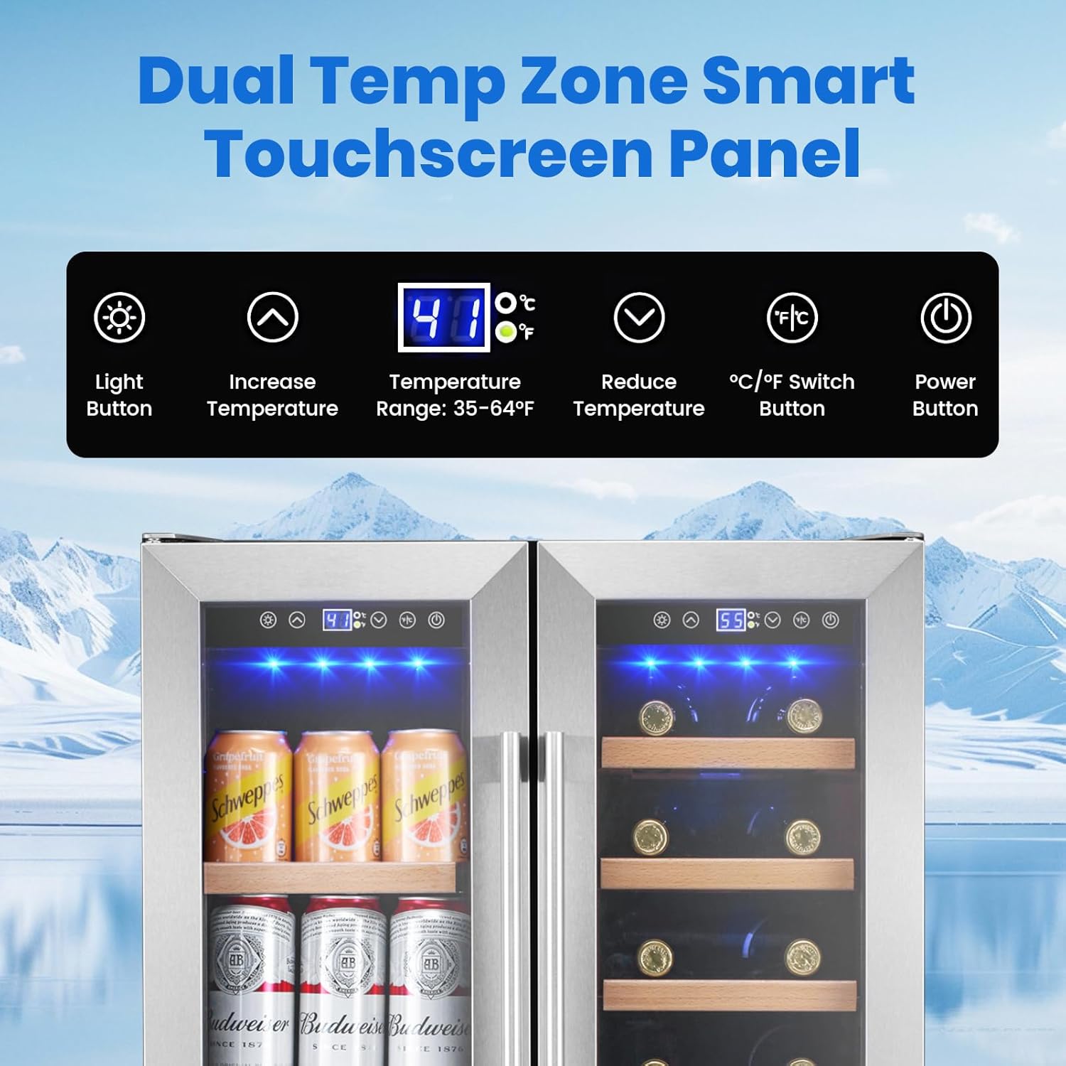 - ăPrecise Dual Zone Cooling ă The wine and beverage refrigerator with dual-zone design provides the versatility to store both your delicate wines and refreshing beverages under their optimal conditions. The ideal temp range of the left zone is 35 -50°F for drinks and the right zone is 41-64°F for wine. With an expansive capacity that can house up to 20 standard Bordeaux 750ml wine bottles and 88 standard 12oz cans, you'll have ample space to curate a diverse collection
