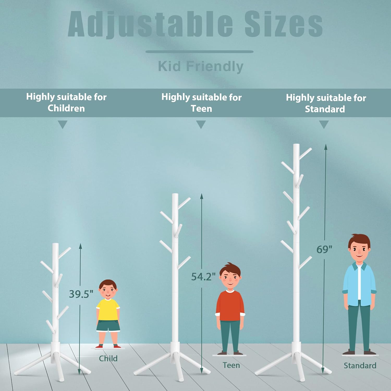- ADJUSTABLE HEIGHT for USAGE: Four sections design and you can customize the rack height and hooks as you like. Two sections heigth (39.5”) can be put at beside; Three sections height (54.2”) is for for a kid use; Four sections height (68.8”) is for adult use