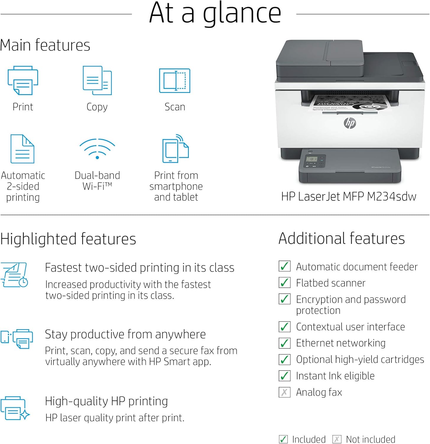 HP Laserjet MFP M234sdw Wireless Monochrome All-in-One Printer with Built-in Ethernet & Fast 2-Sided Printing, Instant Ink Ready (6GX01F) (Renewed)