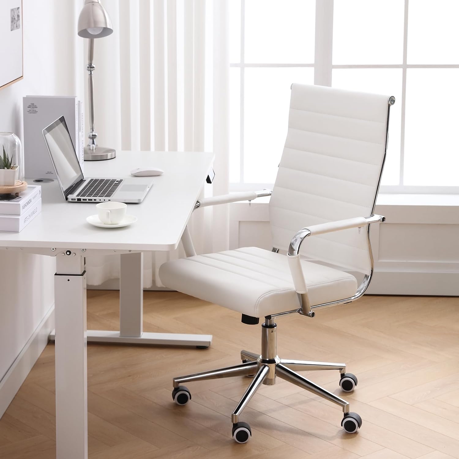 Home Office Chair Ribbed, Modern Leather Conference Room Chairs, Ergonomic Office Desk Chair, High Back Executive Computer Chair, Adjustable Swivel Chair with Arms (White)