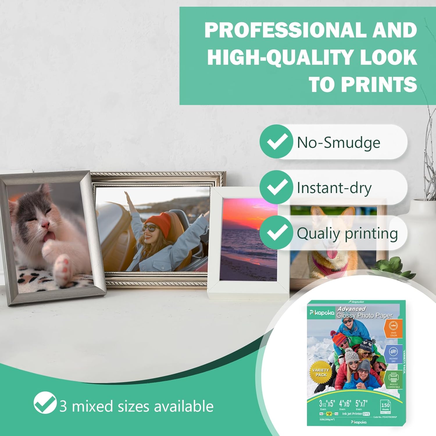 Glossy Photo Paper 3.5x5, 4x6, 5x7, Photo Printer Paper for Inkjet, 150 Bulk Variety Pack, Assorted Sizes, 52lb/200gsm (P3545YW200GP)
