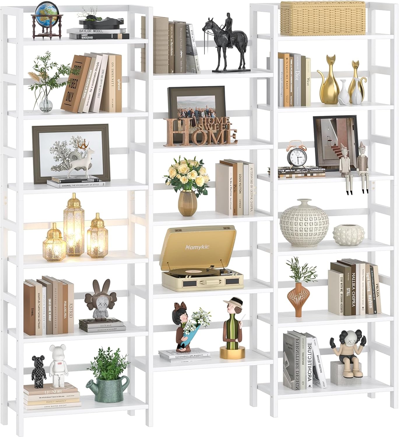 - Extra Large Storage Space: If you are a collectibles lover or a bookworm, donβt miss this affordable and practical bookshelf. Featuring 17 open shelves, this 6-tier triple wide bookcase provides ample storage space for books, decorations, collectibles, potted plants, photo frames, and more. The open design enables you to fetch items with ease. Each layer can hold up to 44 lbs, for a total weight capacity of 748 lbs. Bookshelf measures 61.42" W x 9.84" D x 71.38" H.