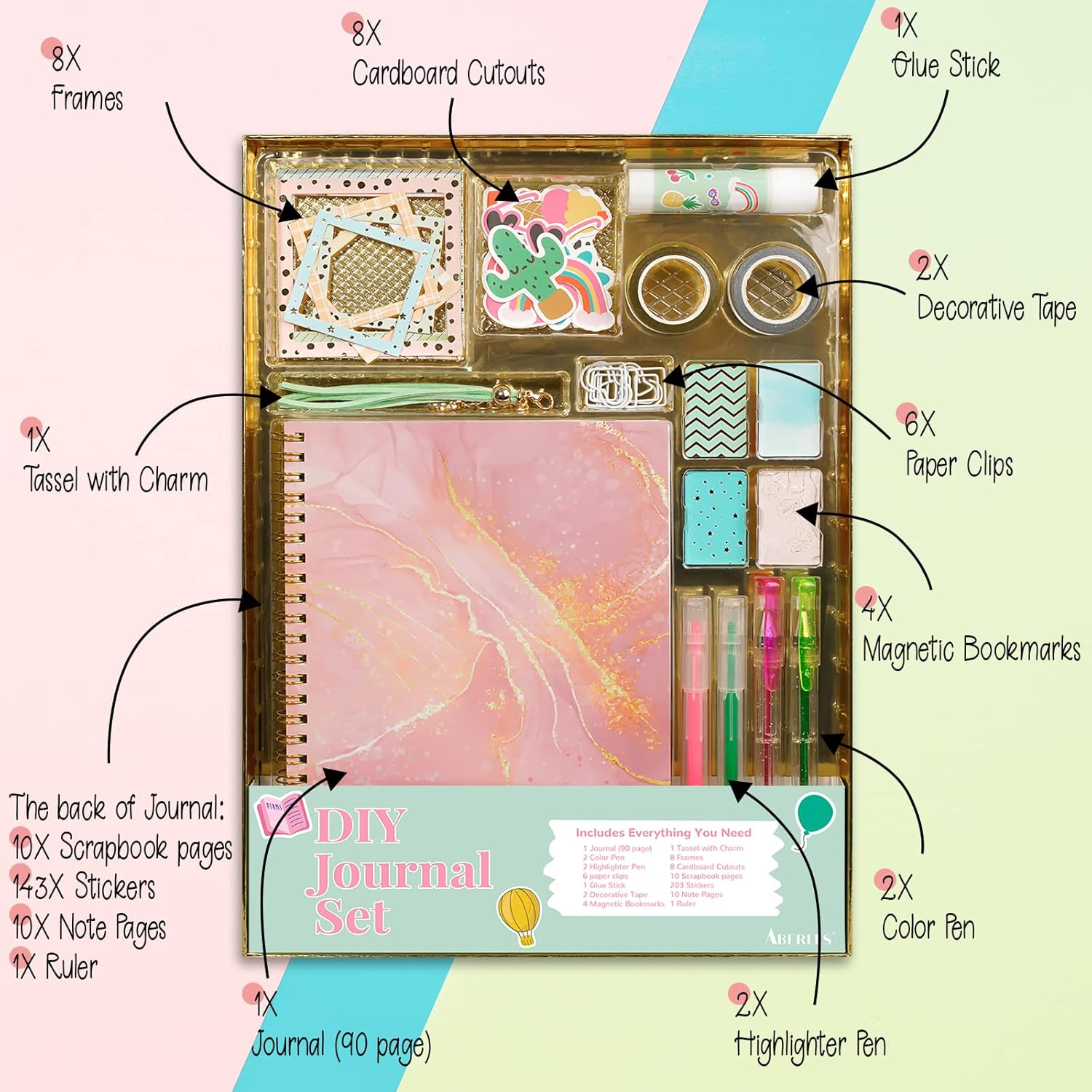 - DIY Journal Set All in One Box: Our 50+ pcs journal kit has everything needed to keep the motivation going. Included 1 beautiful 90 pages journal, 143 stickers, 8 cardboard cutouts, 10 sticky notes, 8 paper frames, 10 scrapbook pages, 4 magnetic bookmarks, 1 glue stick, 1 tassel with charm, 4 pens (2 gel pens & 2 highlighters), 2 glitter tape rolls (silver & gold), 6 paper clips, 1 ruler, they are packed in a hard gift box. Letβs use it to save memories in creativity flow and a fun way!