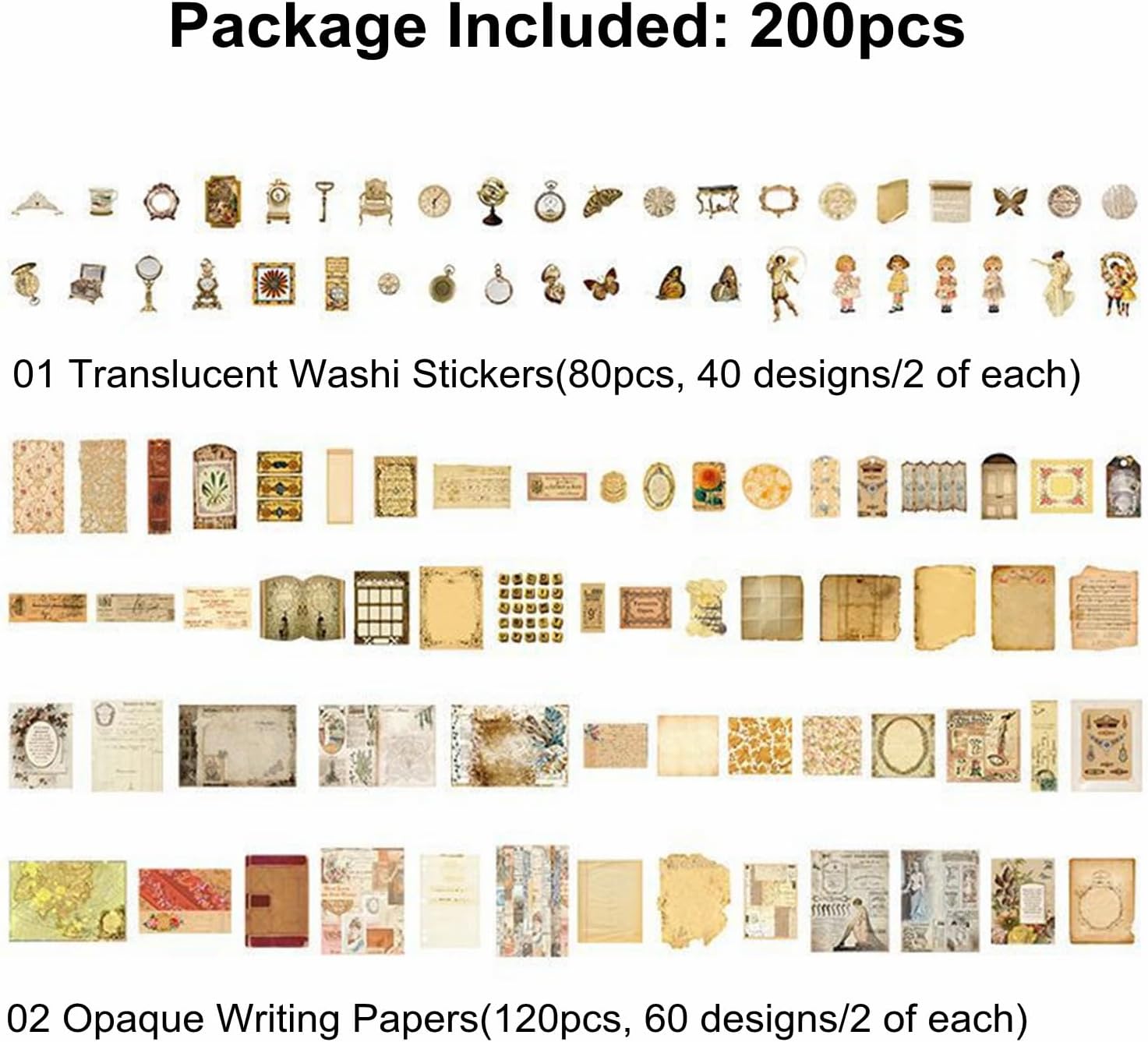 - Design: 80pcs washi stickers with 40 designs, 2 pieces of each; 120pcs vintage printing papers with 60 designs , 2 pieces of each.