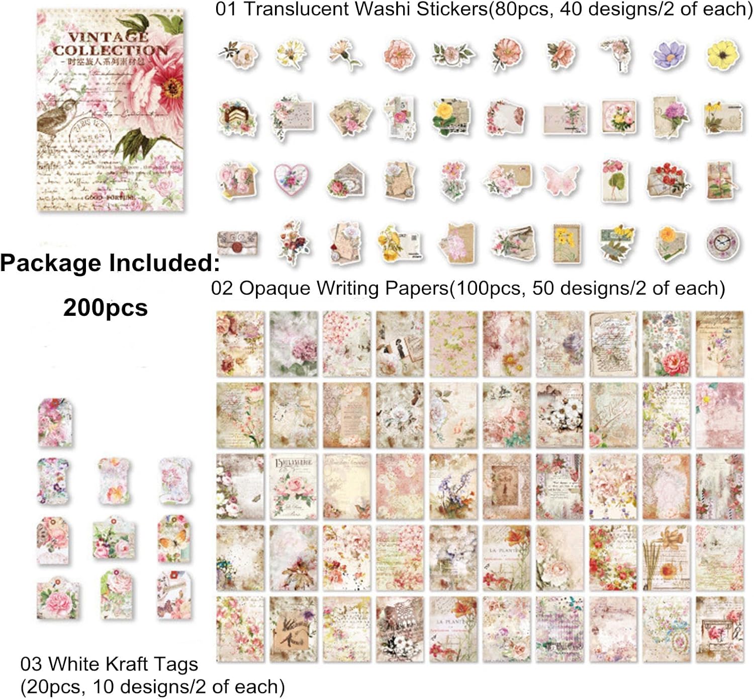 - Design: 80pcs washi stickers with 40 designs, 2 pieces of each; 100pcs vintage printing papers with 50 designs, 2 pieces of each;20 pieces tags with 10 designs, 2 pieces of each.