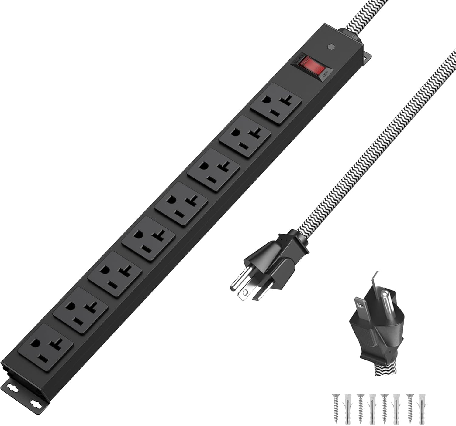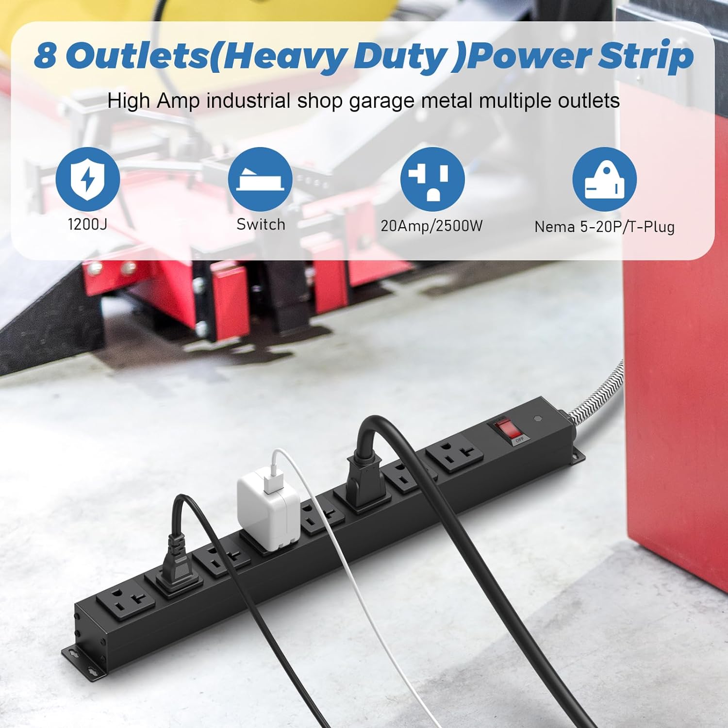 HEZI 20 Amp Power Strip Surge Protector 1200J, Metal 8 Outlets Heavy Duty 20amp, 10Ft 12 Gauge Extension Cord for Appliance Workbench Garage Industrial, Combine with T-Plug Adapter,5-20R T-Slot