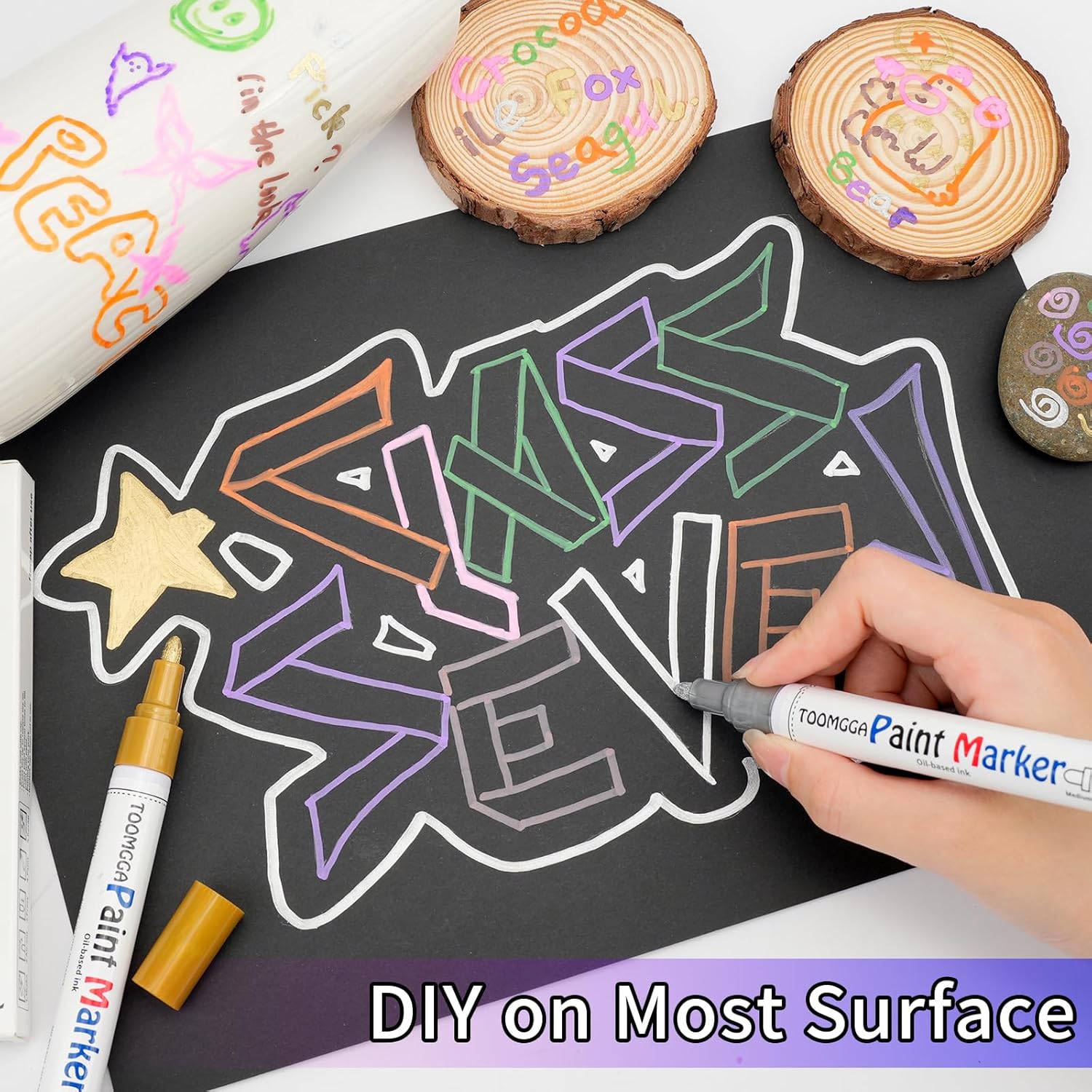 - Extensive Use: Paint pens mark steel and mark objects such as tires, bolts, metal pipes, bumper panels and more. Not just metal, Gold & Silver permanent markers can be used on rocks,wood, ceramic, canvas, tires, rubber, glass and plastic surfaces