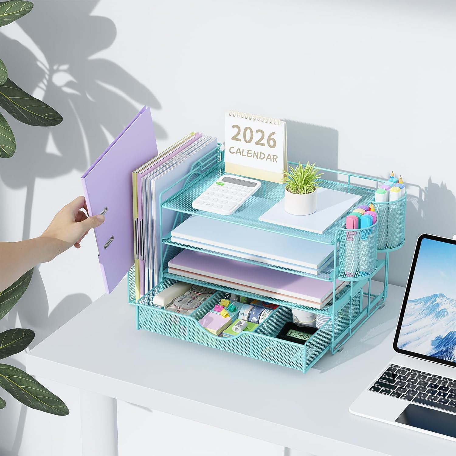 gianotter Desk Organizers and Accessories with File Holder, 4-Tier Desk Accessories & Workspace Organizers with Drawer and 2 Pen Holder, Paper Organizer for Office Supplies (Blue)