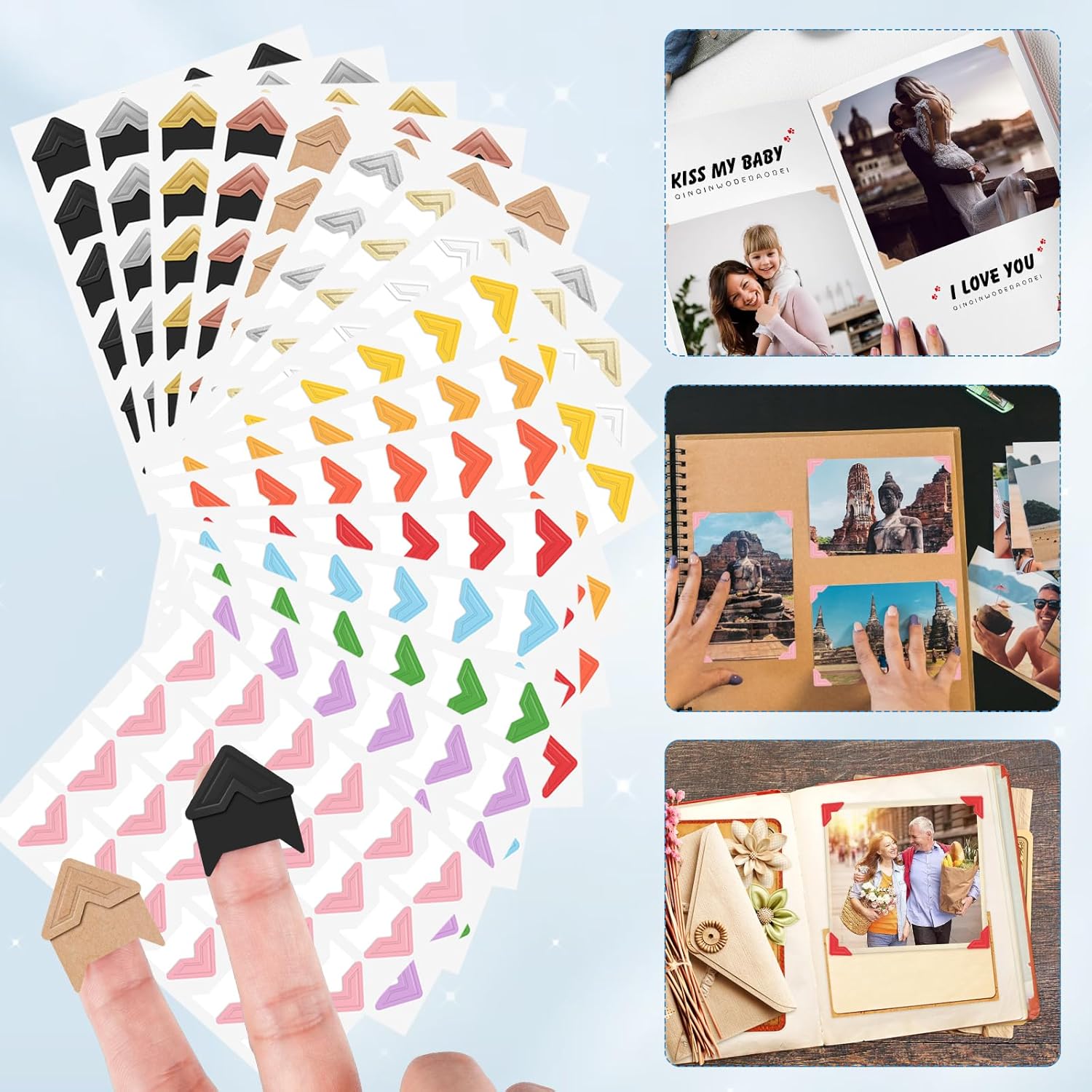 GOONAVI 15 Sheets 360 PCS Multicolor Acid-Free Photo Corners Notebook, Self-Adhesive Photo Corners for DIY Photo Album Journal, Photo Corner Stickers for Trip Journal Memory Book