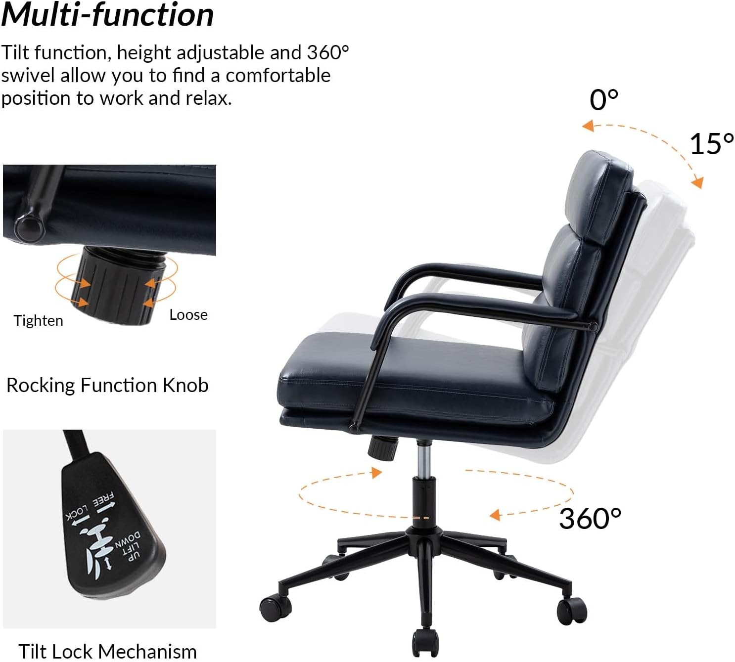 - Tilt Lock and Center Tilt- With its tilt function, the chair offers the flexibility to lean back for a relaxed and comfortable experience, enhancing your workday or meetings with a leisurely touch.