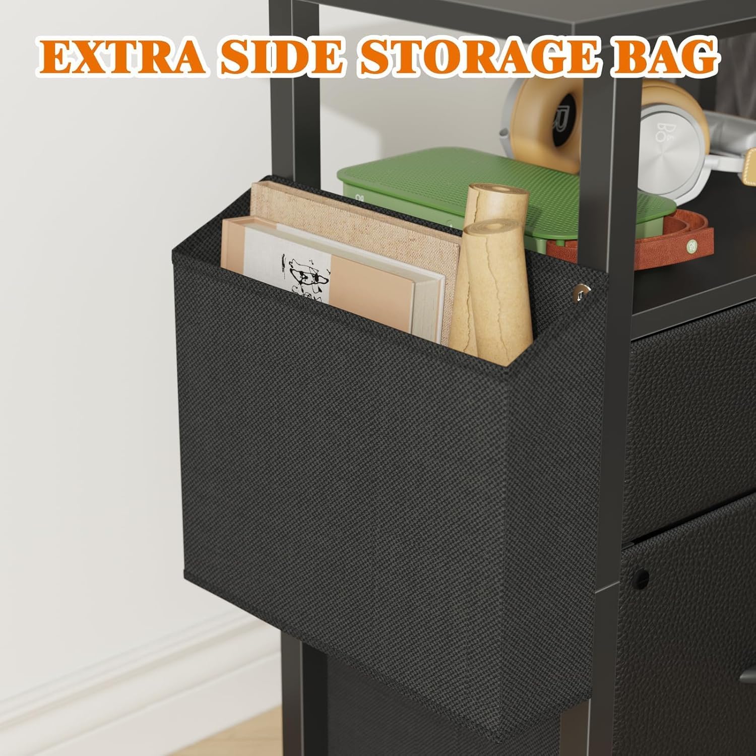 - ă2 Drawers and 1 Storage BagăThe bottom drawer of office filing cabinet is perfect for hanging A4-sized file folders. What's more, there are extra storage bag and open shelf to cater to your diverse storage needs, providing larger room for your files, books, and other office supplies