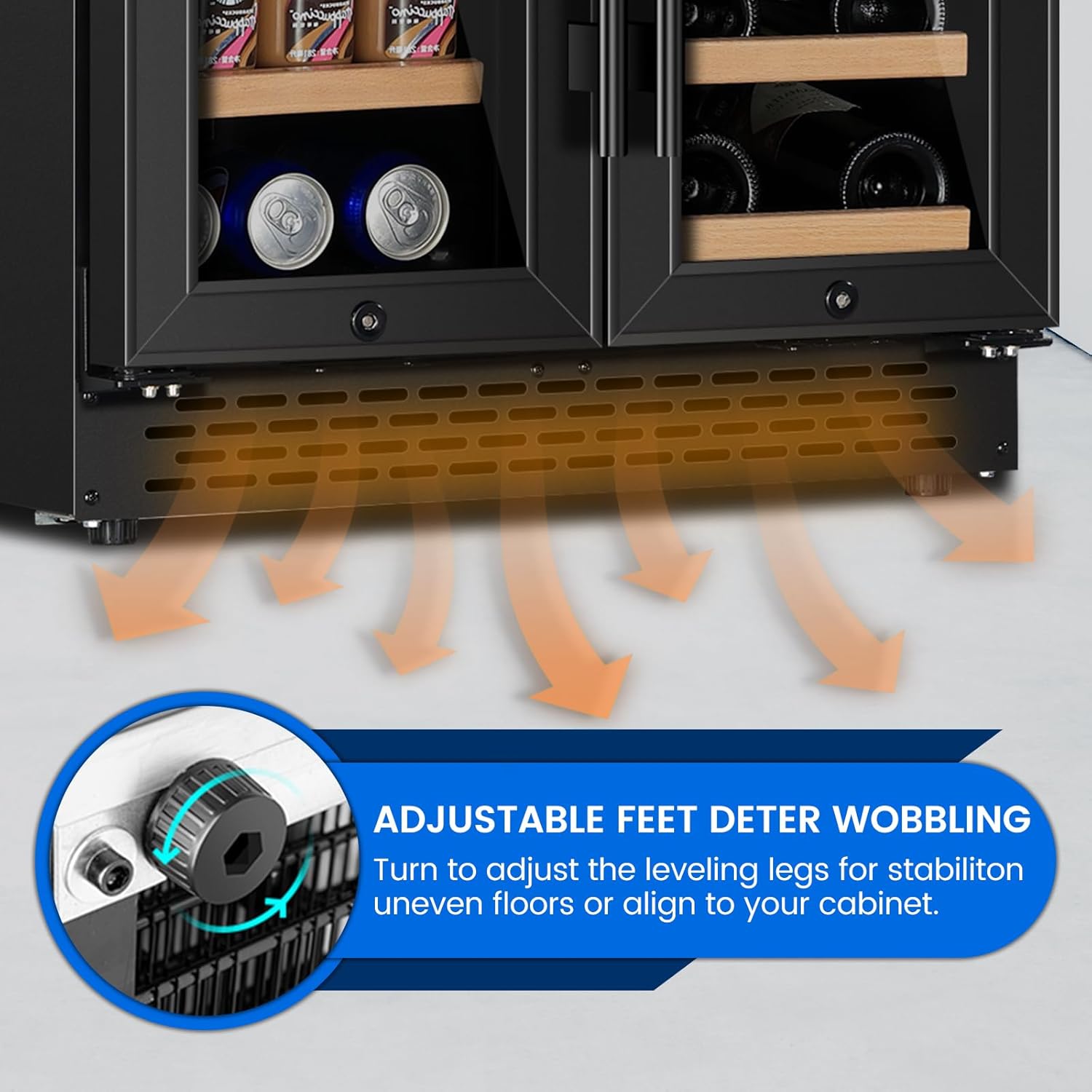 - ăQuiet and Efficient Cooling PerformanceăThe dual zone beer and wine cooler is outfitted with an advanced compressor and a high-quality fan circulation system. The combination of these elements enables the even distribution of cold air throughout both cooling zones, ensuring a consistent level of humidity for each and every bottle and can stored within. With an operating noise level of less than 38 dB, it creates a peaceful and quiet environment, free from disruptive vibrations. The double-layered glass door not only acts as a barrier against UV rays, protecting the contents from potential damage, but also plays a crucial role in maintaining a stable internal temperature.