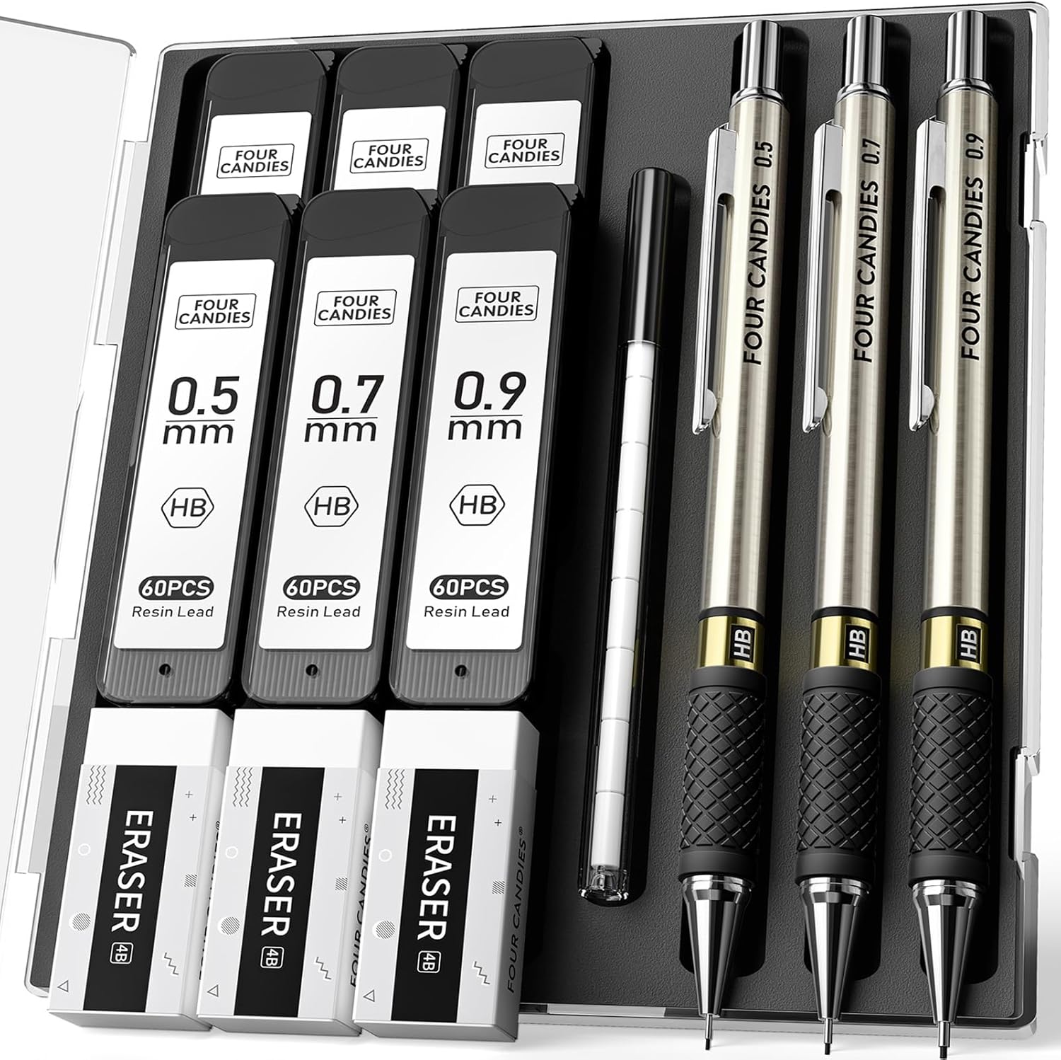 Four Candies Metal Mechanical Pencil Set - 3PCS 0.5 & 0.7 & 0.9 mm Art Pencils & 360PCS HB Lead Refills & 3PCS Erasers & 9PCS Eraser Refills, for Drawing, Writing, Sketching, Drafting - With Case