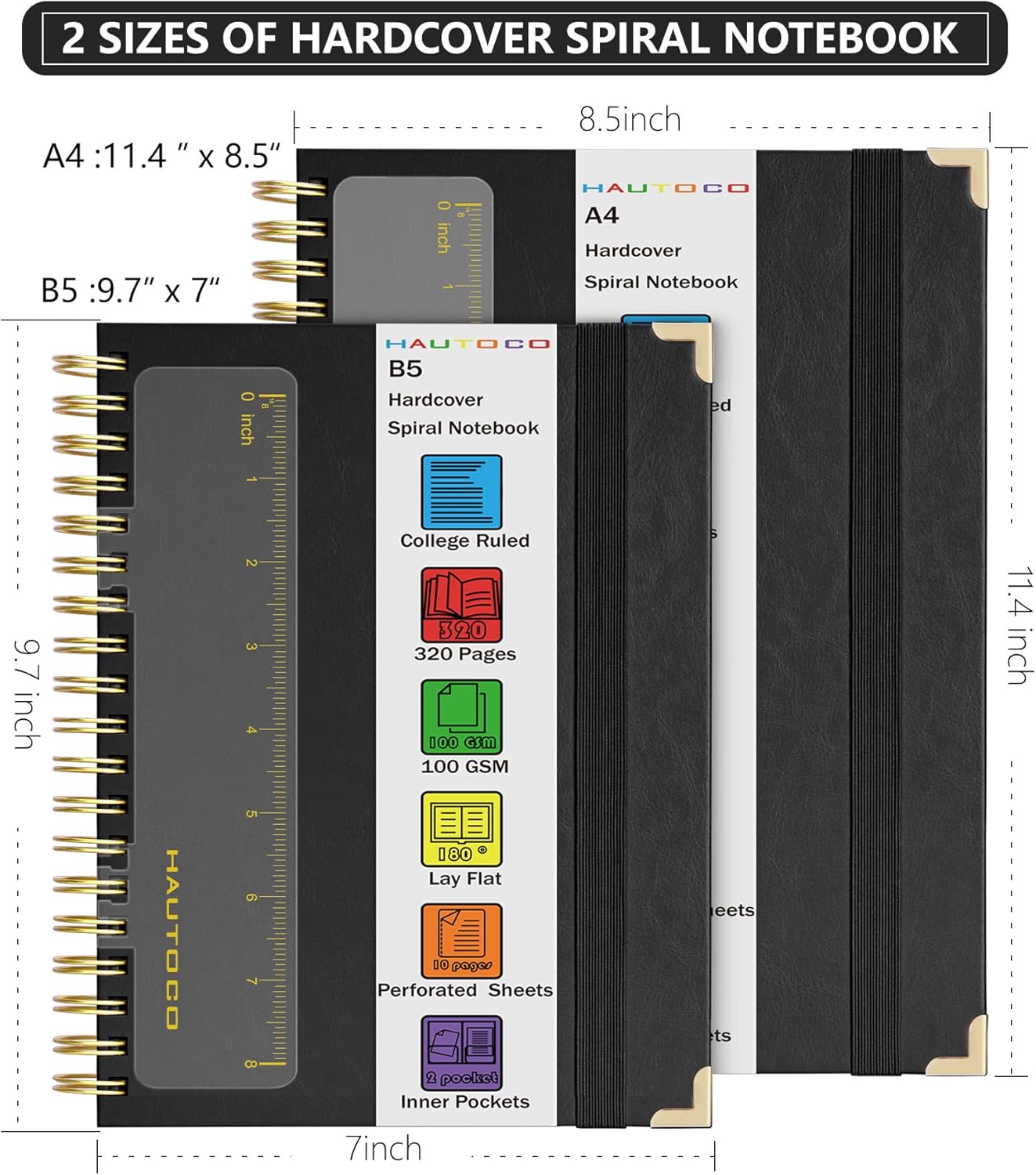 HAUTOCO Spiral Notebook Journal 8.5"x 11", College Ruled Leather Notebook with 320 Pages, 100 GSM Paper, A4 Hardcover Notebook, Lined Journaling Notebooks for Work, Office, School, Business, Black