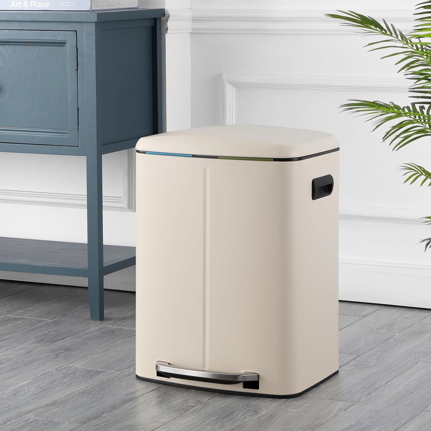 happimess HPM1005F Marco Rectangular 10.6-Gallon Double Bucket Trash Can with Soft-Close Lid, Fingerprint Resistant, Modern, Minimalistic for Home, Kitchen, Office, Bathroom, Limestone Beige
