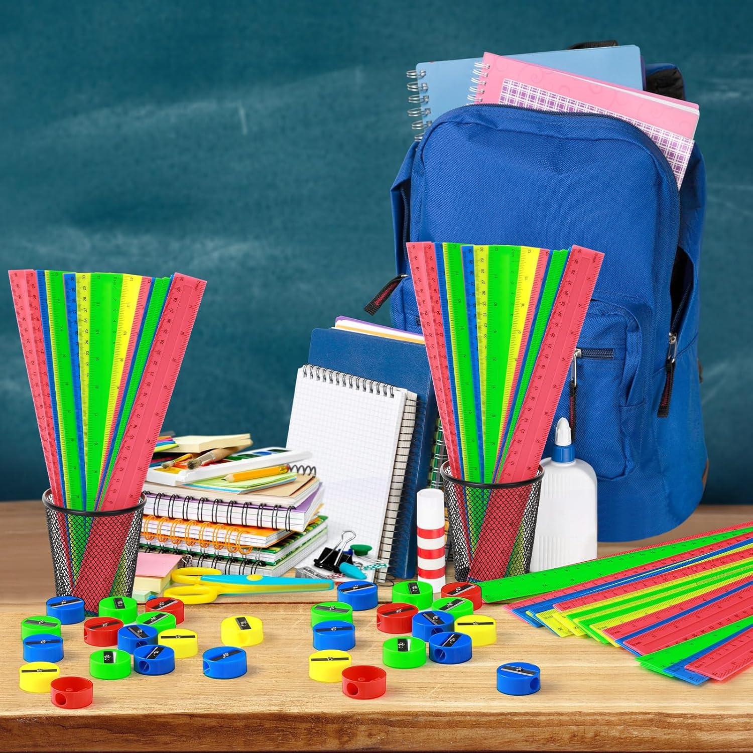 100 Pcs Plastic Rulers and 100 Pcs Mini Round Manual Pencil Sharpener Bulk, 4 Assorted Colors Pocket Sized Pencil Sharpeners Colorful Straight Ruler Back to School Supplies for Kids (Novel,12 Inch)