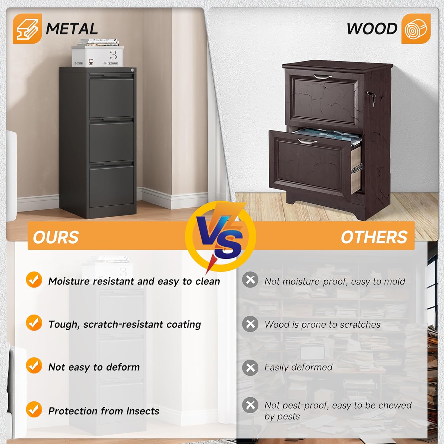 - 🛎️【SUPER FUNCTIONAL VERTICAL FILING CABINET】: Our this file cabinet has three large drawers with 15.7 inches depth, which provides you with large enough storage space. And it is equipped with adjustable hanging rods to store different types of files, such as letter, legal, A4, F4 size folders. It is perfect for you to customize the way you organize your files!