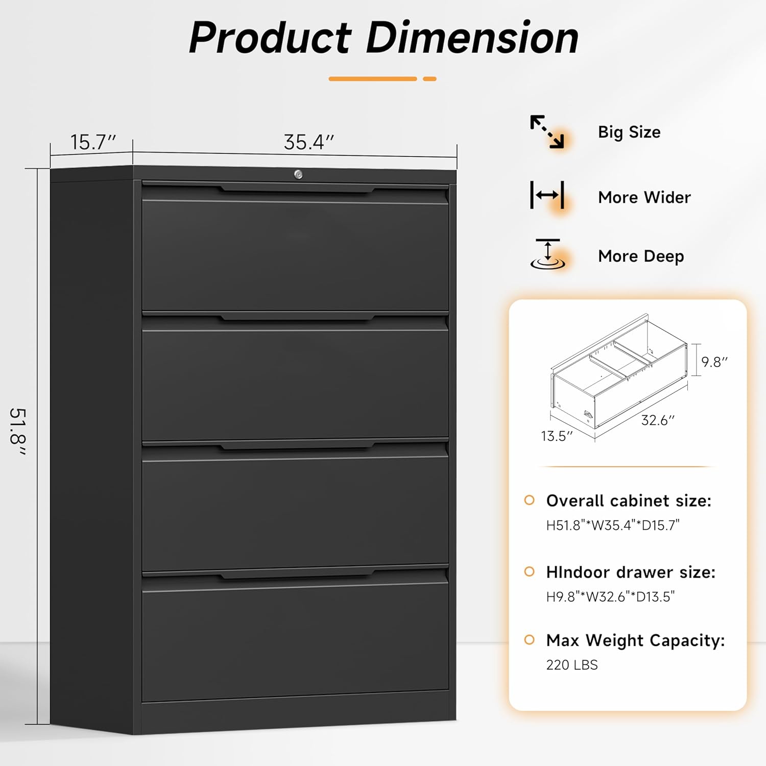 - 🪅【LARGE CAPACITY FOUR DRAWER】Our 4 drawer lateral file cabinet has a huge storage space, 51.8" high * 35.4" wide * 15.7" deep. And it comes with an adjustable hanging rod to store different types of files, such as letter, legal, A4, F4 and other size folders. It is perfect for you to customize the way you organize your files!