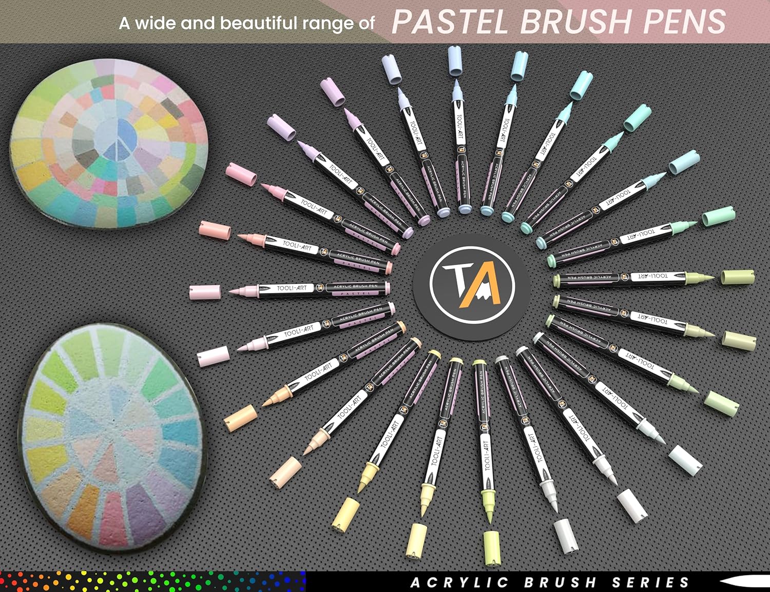 24 Flexible Brush Tip Acrylic Paint Pens Markers Set 1-7mm Line for Rock Painting, Brush Lettering, Glass, Mugs, Wood, Metal, Canvas, Fabric, Plastic Non Toxic Waterbased Quick Drying Assorted Pastel