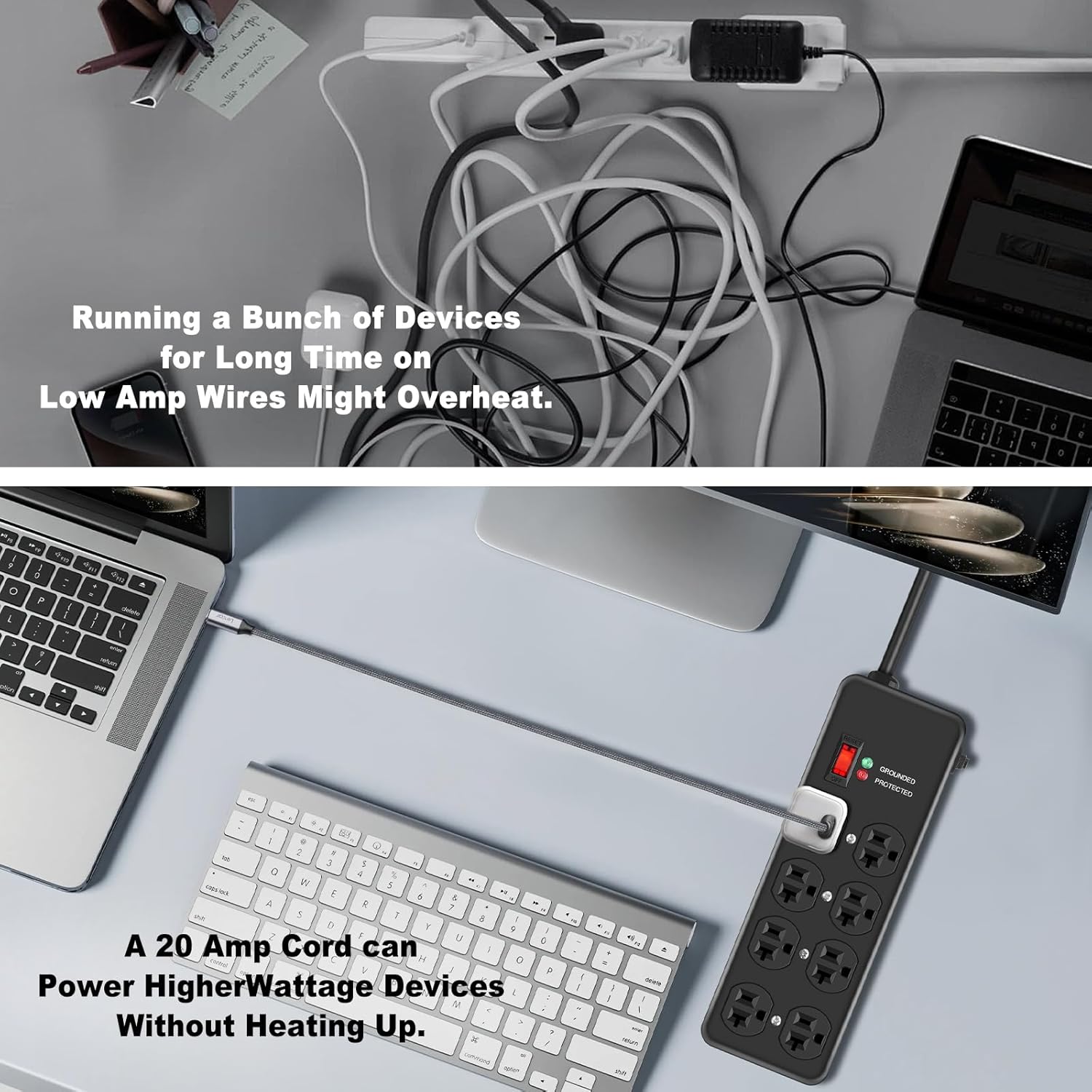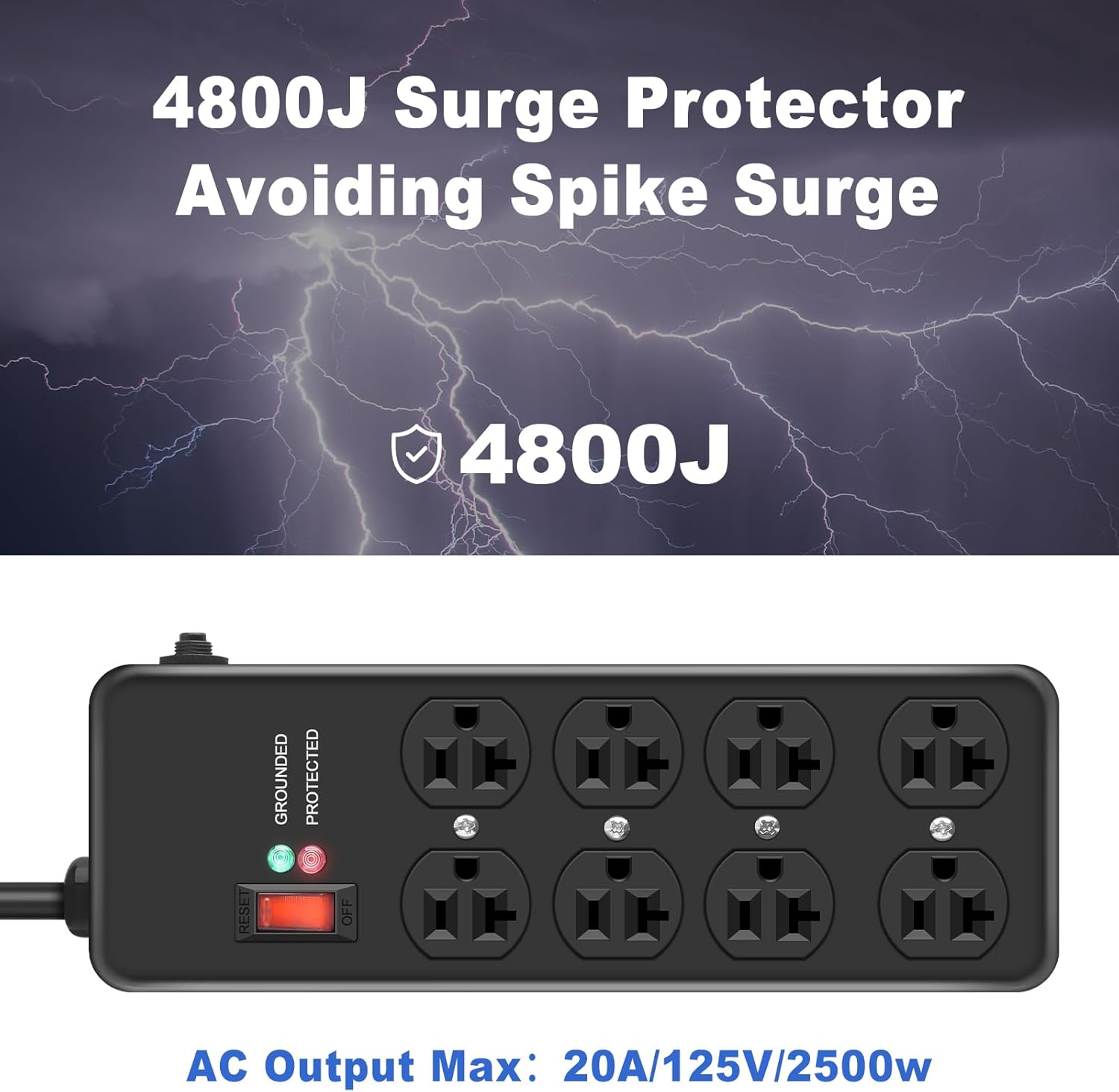 - MULTI-OUTLET SURGE PROTECTOR POWER STRIP:Features 4800J surge protector and a 20A circuit breaker, providing a reliable power supply for devices while preventing short circuits, overcurrent, overheating, and overvoltage. If the current exceeds 20A, the circuit breaker automatically cuts off power to prevent damage. After powering off, simply reset by turning off the power and pressing the reset switch.