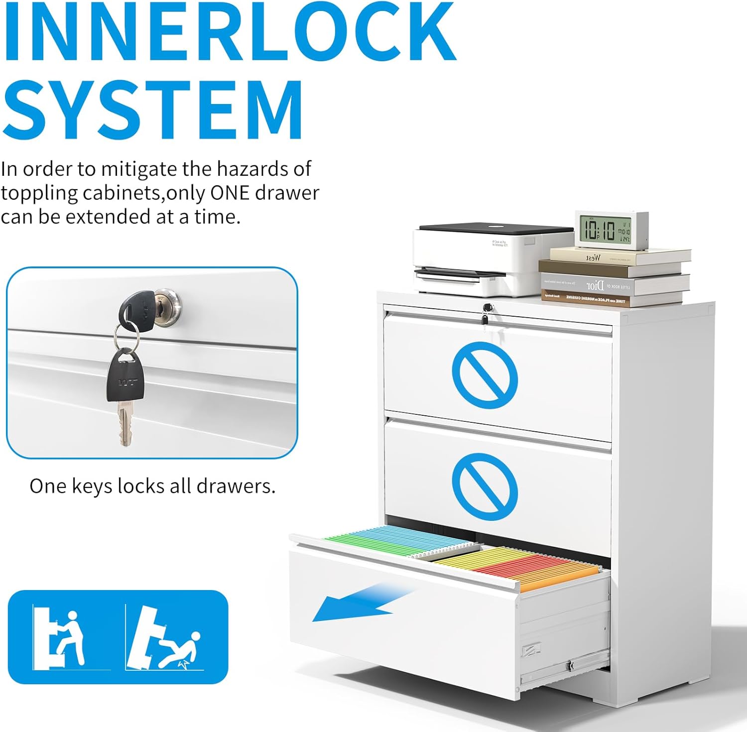 - 【Enhanced Security and Safety】This filing cabinets for home office has one lock and 2 keys, one single lock can secure all the drawers, but interlocking mechanism allows only one drawer to open at a time to add security. Additionally, the anti-tilt device also enhances safety further by fixing the metal filing cabinet to the wall.