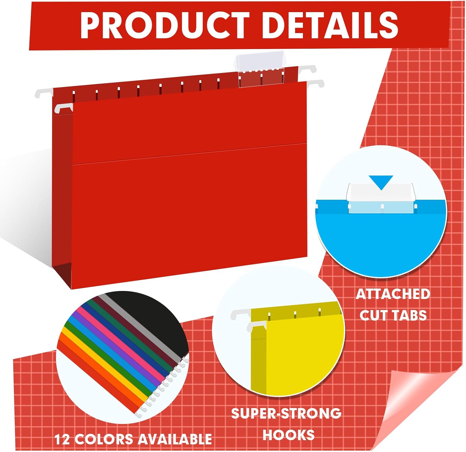 - ENHANCED ORGANIZATION: Straighten up your files and break your file drawers into easily-spotted smaller groups with 12 assorted colored hanging file folder.
