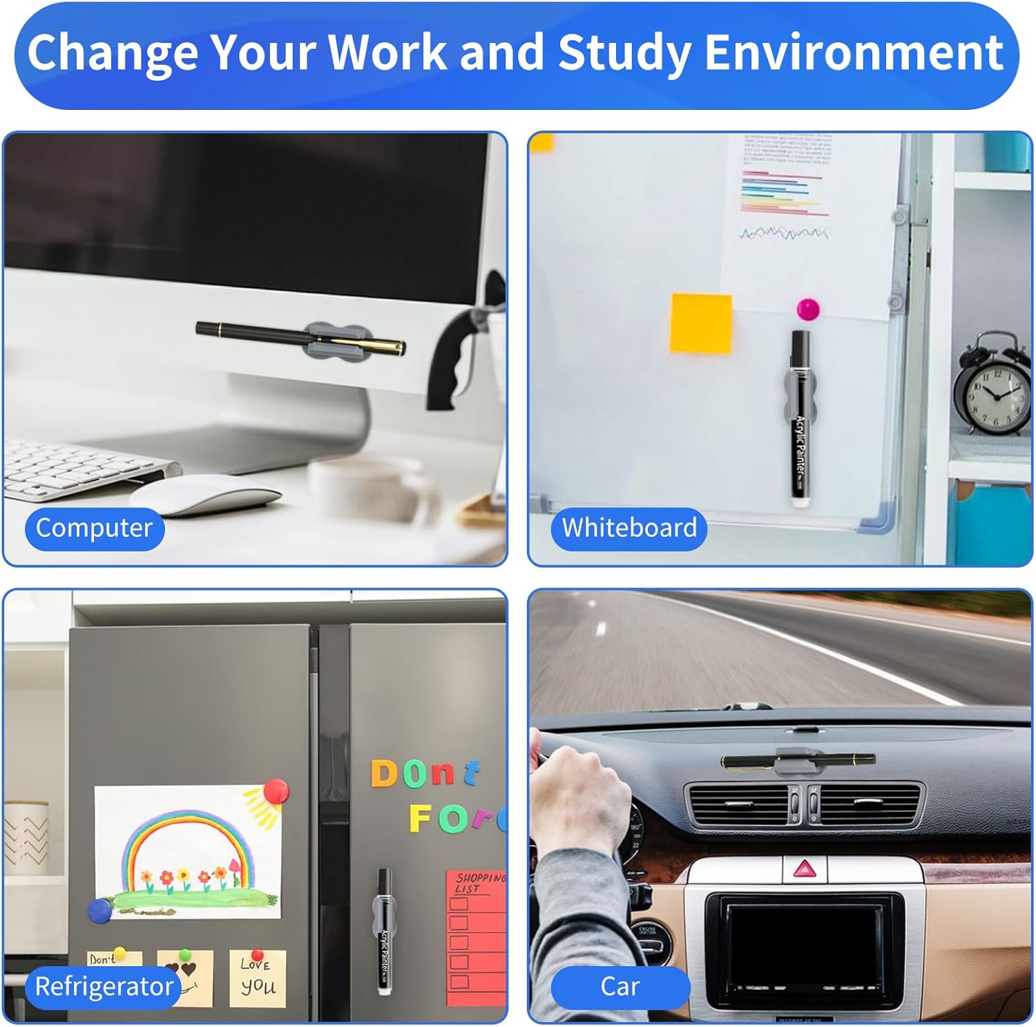 - ăChange Your Work and Study EnvironmentăThese pen pencil holders can not only be easily stuck on the desktop, but also can be fixed on the wall, clipboard, car, monitors, mirrors etc. They can hold thin and thicker pencils, pens, markers, etc. which allows you to save time by no longer wasting it searching for pens on your desk. It is an artifact that comes to your doorstep for whom need to organize a large amount of stationery.