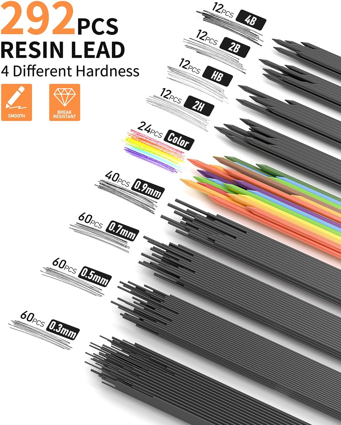 - Exquisite Artist Set: Includes 5 PCS metal drawing mechanical pencils (0.3, 0.5, 0.7, 0.9, 2.0mm), 4 tubes of 0.3, 0.5, 0.7, and 0.9mm graphite lead refills, 4 tubes 2.0mm (4B, 2B, HB, 2H,) graphite lead refills, 2 tubes 12 color lead refills, 2pcs 4B soft erasers, a kneaded eraser, a gum eraser, 2pcs lead sharpener, 9pcs cap eraser refills, a plastic case.