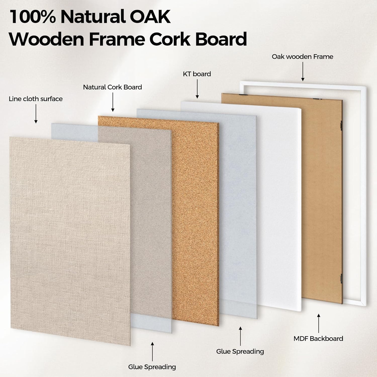 - Oak Frame Material: Our cork boards for walls is made of 100% oak wood which has well self-healing ability and repairability. The pin board features a four-ply splint design that is strong and thick enough not to be punctured by thumbtacks.