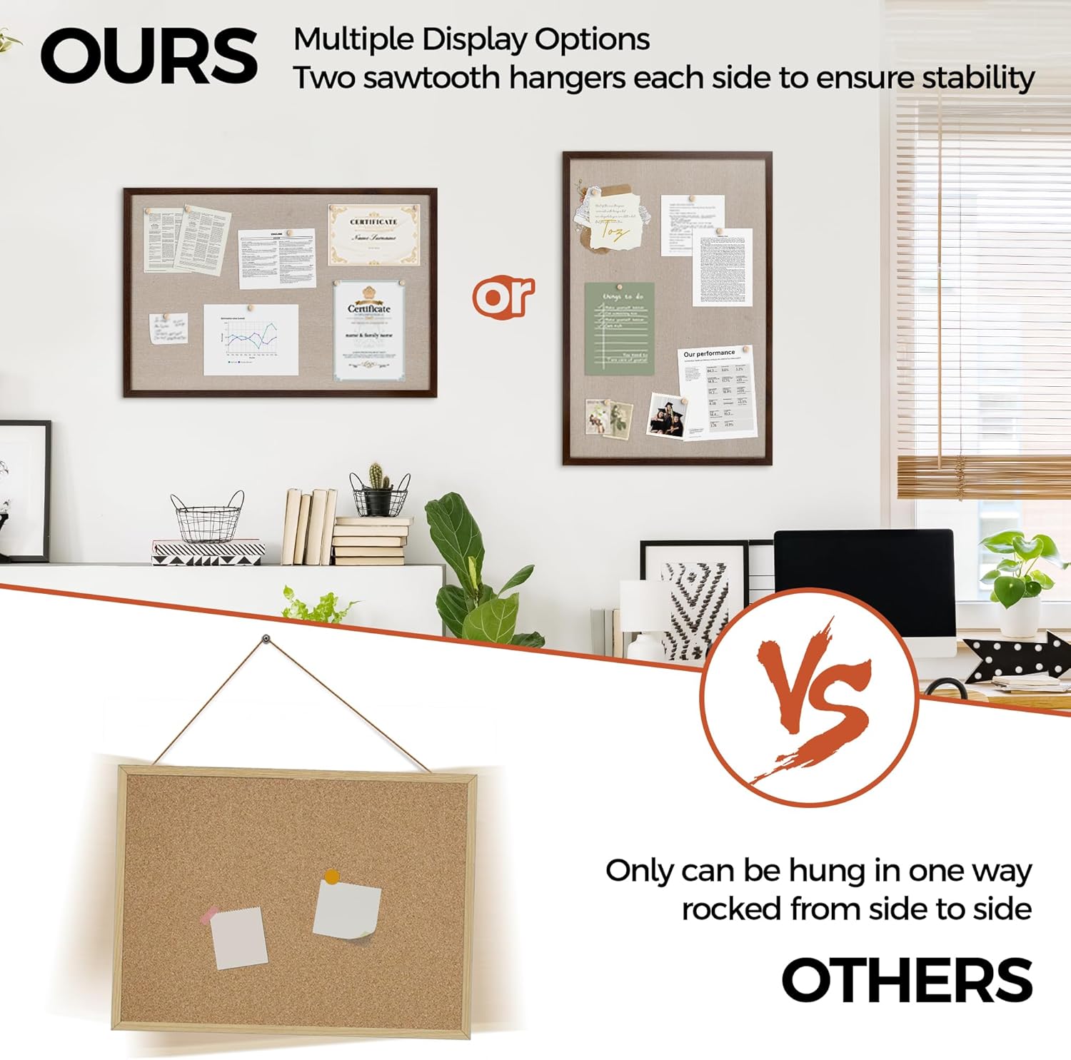 - Unique Design: Easily customize the board orientation to fit your space. Natural cork bulletin board add a classic look to your office or home. Both strong and stylish, it will be a great addition to your space.