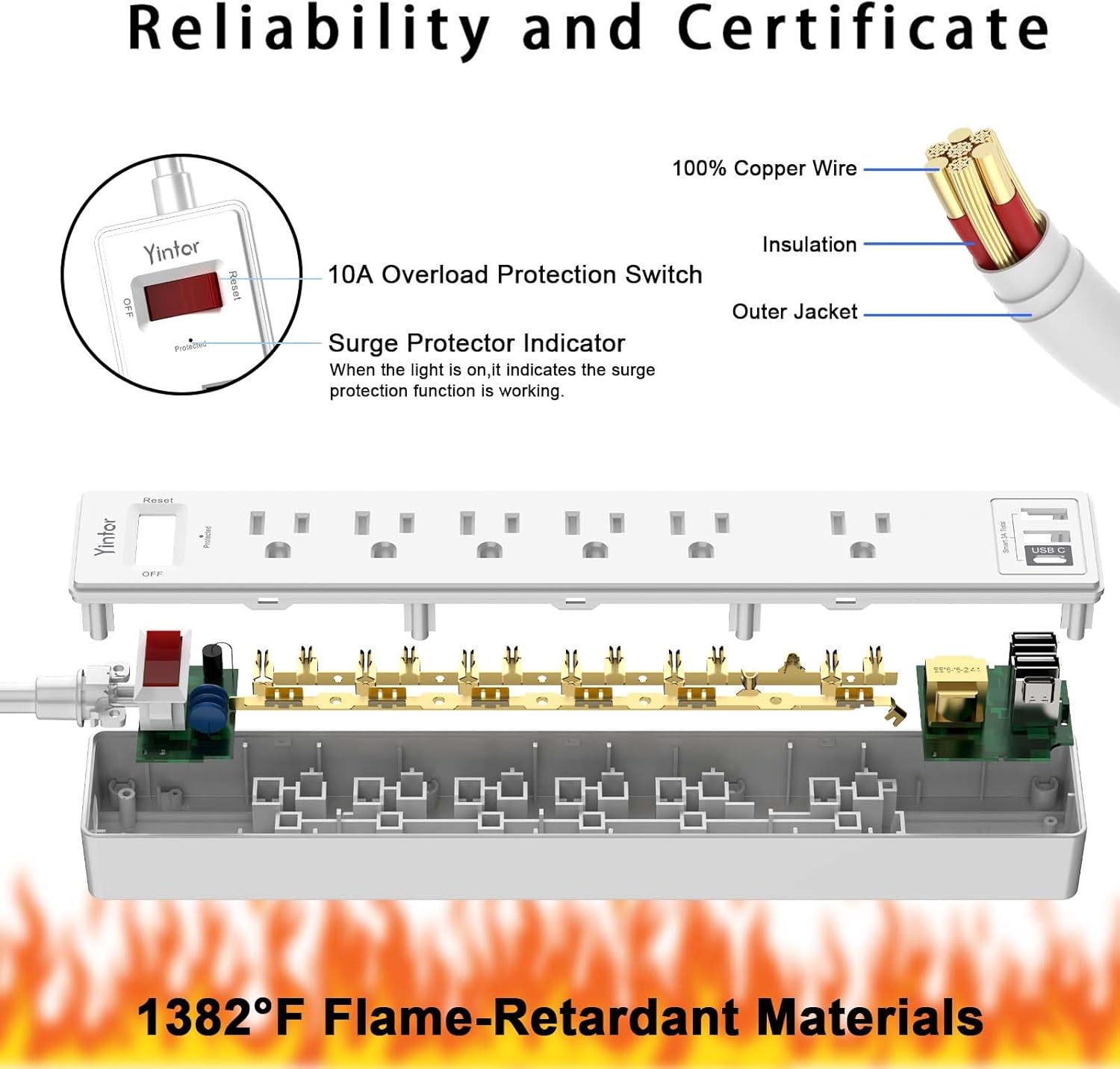 10 Ft Power Strip Surge Protector - Yintar Extension Cord with 6 AC Outlets and 3 USB Ports for Home, Office, Dorm Essentials, 1680 Joules, ETL Listed, White