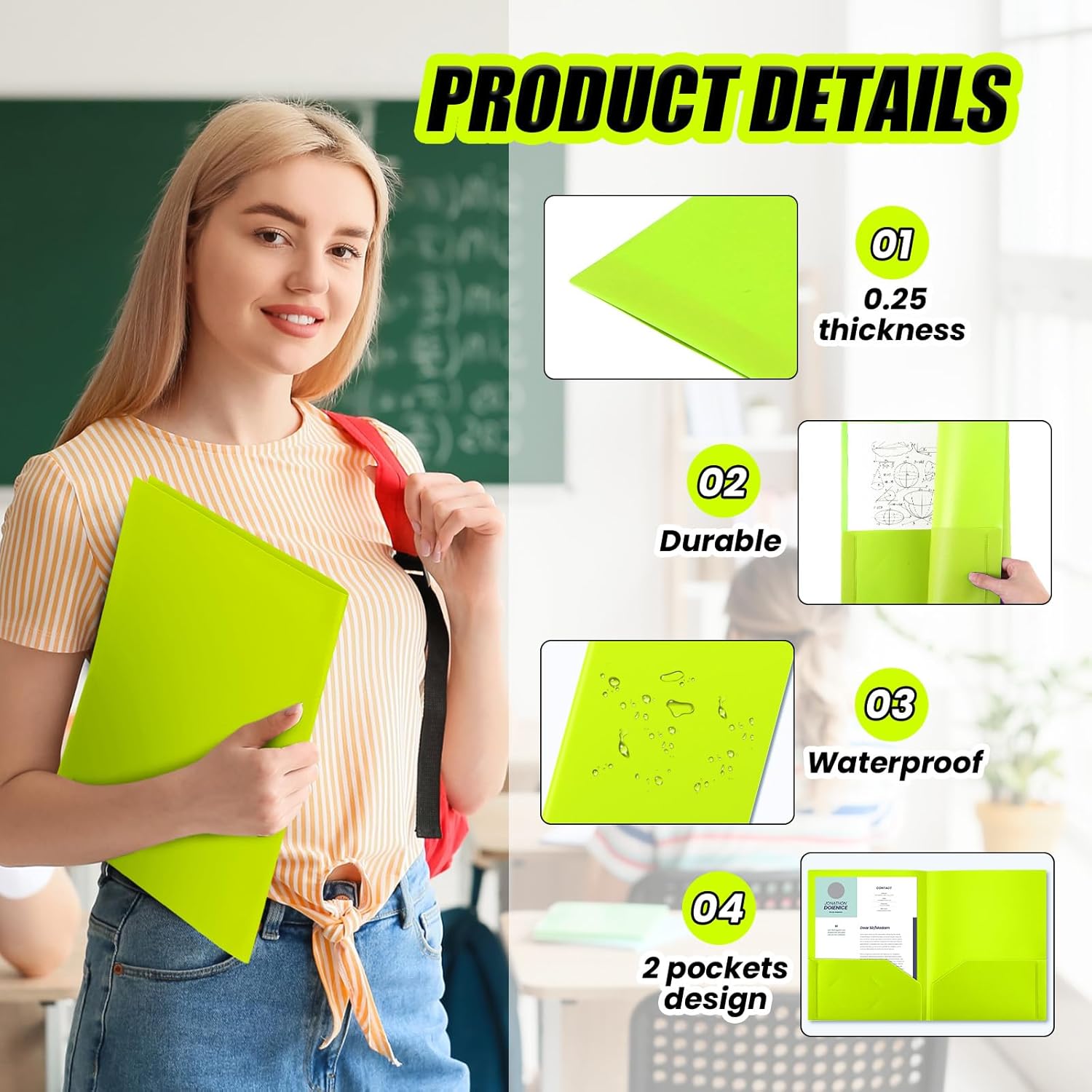 Gueevin 50 Pcs Plastic Folders with Pockets, Back to School Two Pocket Folder Fit Letter Size, Heavy Duty School Business Card Holder for Home Office, 11. 61 x 9. 45 Inches (Fluorescent Green)